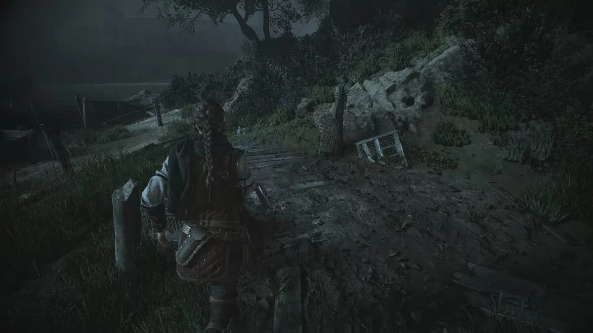 После парома Амиция окажется под большим каменным мостом. Рядом стоит тележка, по которой можно забраться. Подведите её к первому доступному возвышению и посмотрите наверх, на деревянные конструкции. Там вы найдете небольшой мостик, который держит цепь. Опустите его пращой и поднимайтесь. В итоге мост должен оказаться слева, а Амиция пойдет вдоль обрыва. В самом конце вы найдете цветы.
