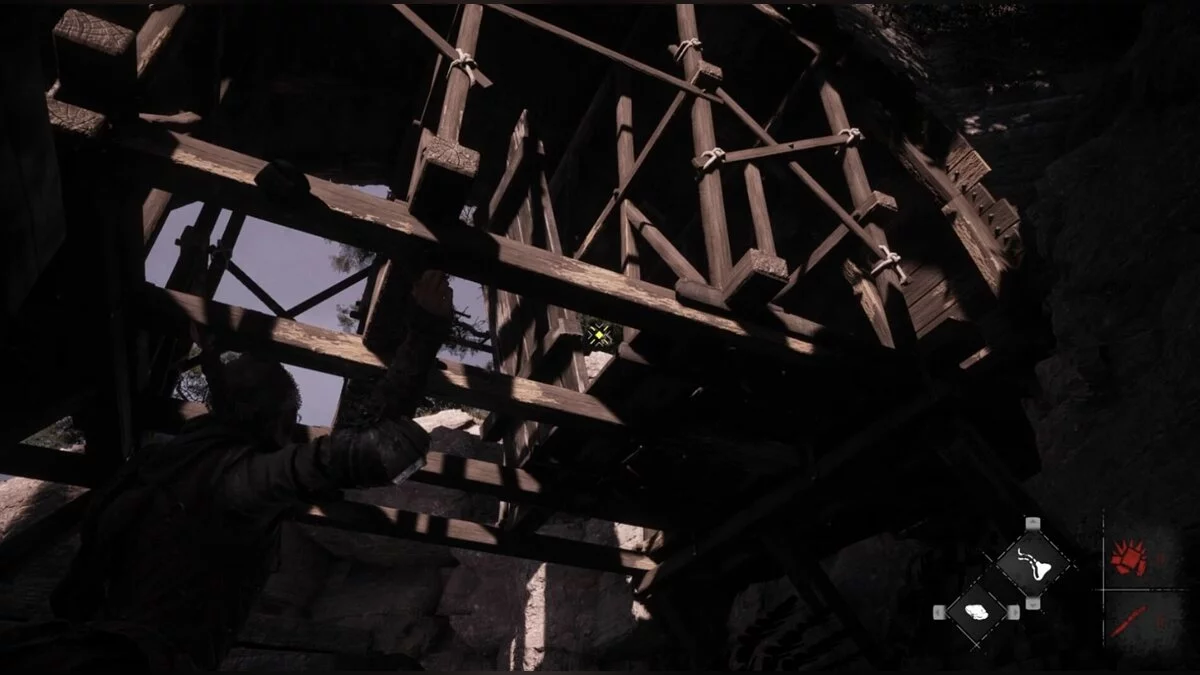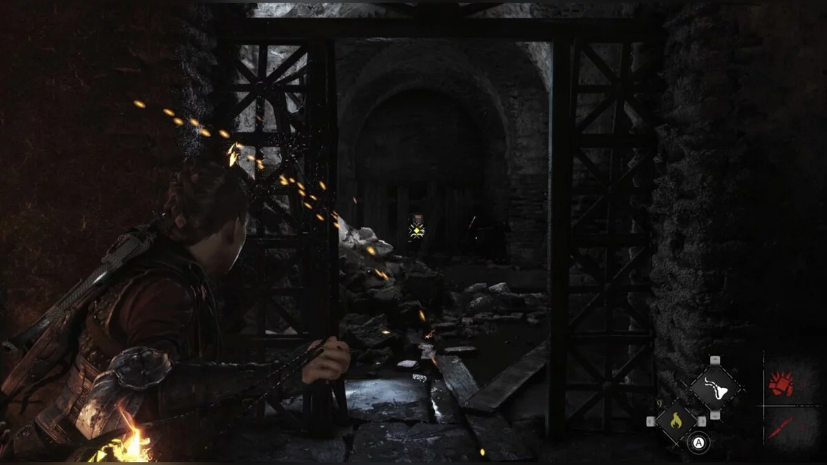 Чуть позже, после очередной сцены, Гуго убежит. Догнав его, поговорите с Софией и проходите в развалины. Сразу после входа с левой стороны будет бревно, около которого можно прицепить канат к арбалетному болту. Выстрелите в дверь напротив и откройте проход. Поднимитесь наверх и сразу же поверните направо.