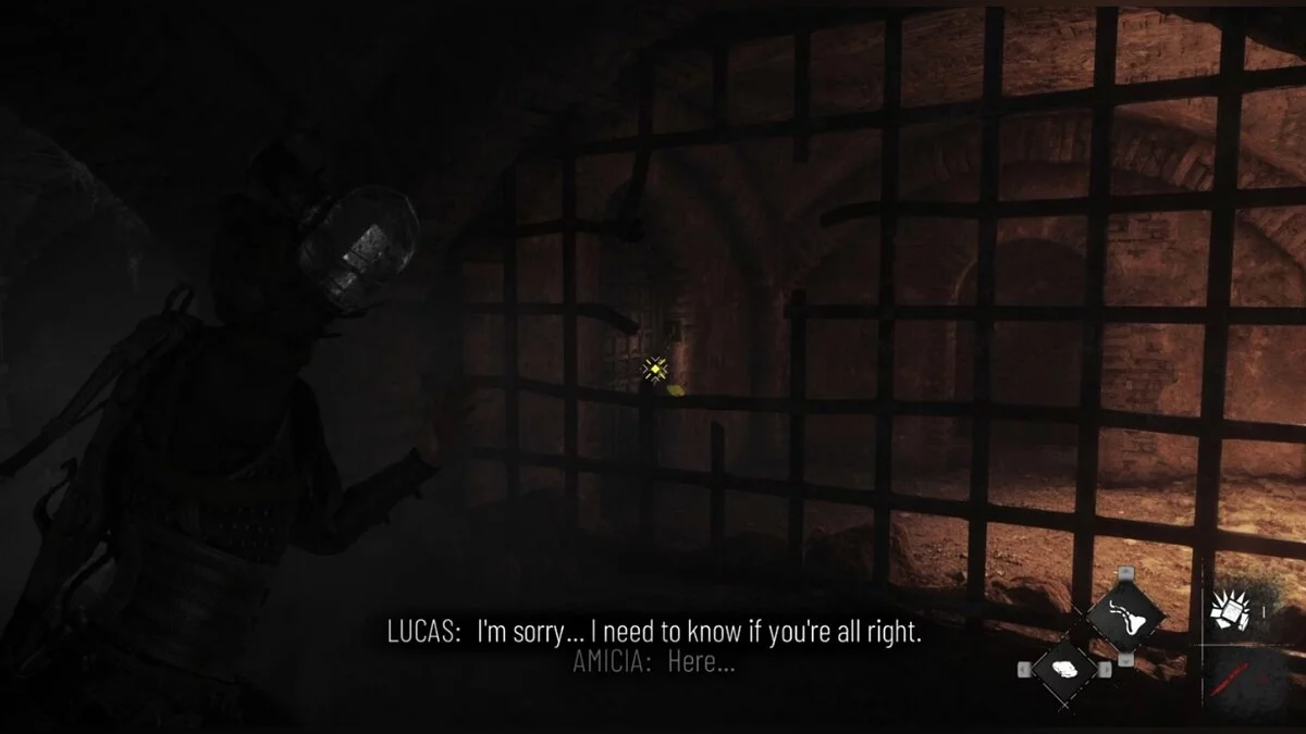 Чуть позже в этой же главе вы будете вместе с Лукой искать магистра. Вам придется преодолеть несколько препятствий и солдат, но в итоге вы доберетесь до закрытого не то подвала, не то строения. Там будет множество мух и трупов. Ваш путь разделится на две лестницы. Поднимитесь по правой и пройдите до конца, одна из женщин окажется жива. Поговорите с ней, чтобы получить воспоминание.