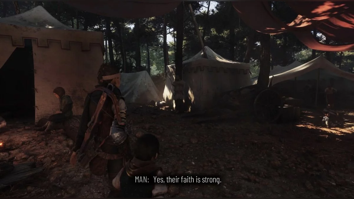 Когда попадёте в лагерь паломников, героев встретит женщина. Поговорите с ней и двигайтесь вглубь лагеря, придерживаясь левой стороны. Между палаток будет поворот налево. Ориентируйтесь на мужчину, прислонившегося к дереву. Дорожка ведет к качелям. Взаимодействуйте с ними и получите воспоминание.