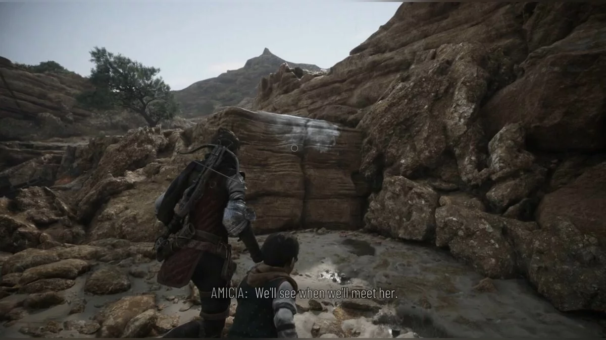 От лодки идите по тропинке, пока не доберетесь до развилки. Поверните направо и двигайтесь до дерева с красной лентой, вы услышите странный звук, который Амиция обсудит с Лукой.