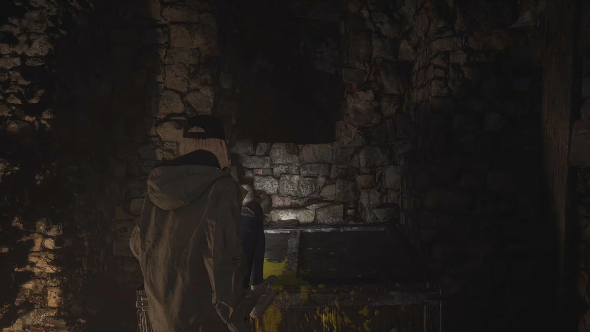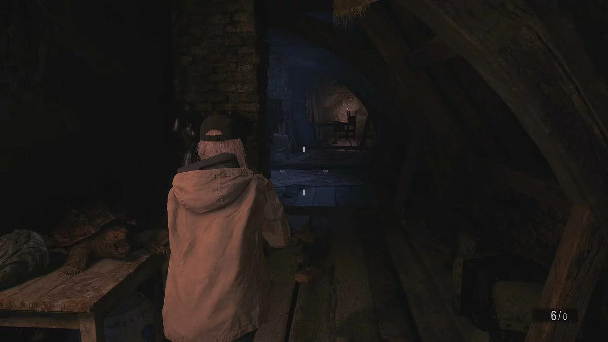 Проходим по ней и пролезаем через отверстие в стене. В конце тропинки используем лестницу и поднимаемся на чердак. Идём вперёд и проходим через деревянную дверь.