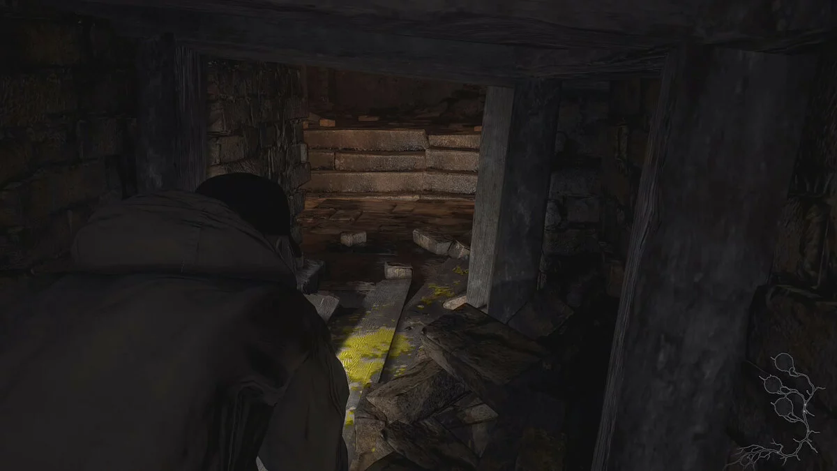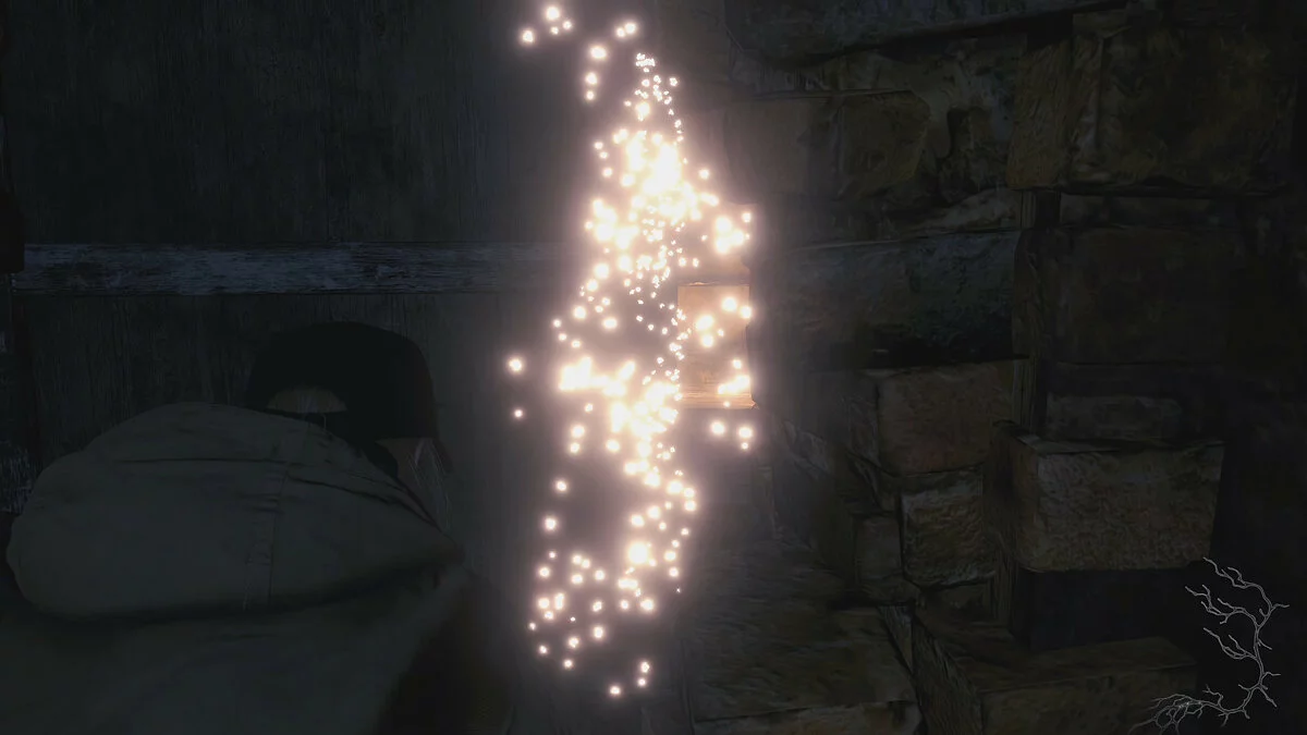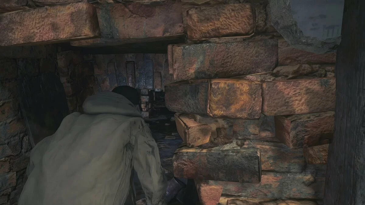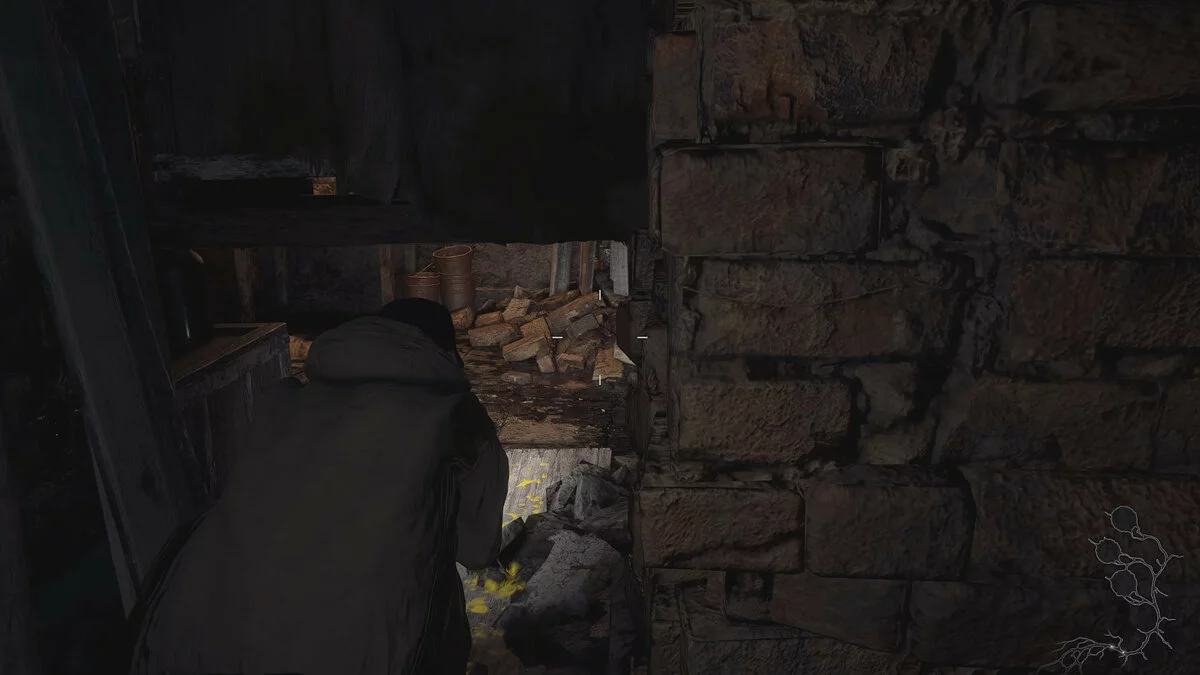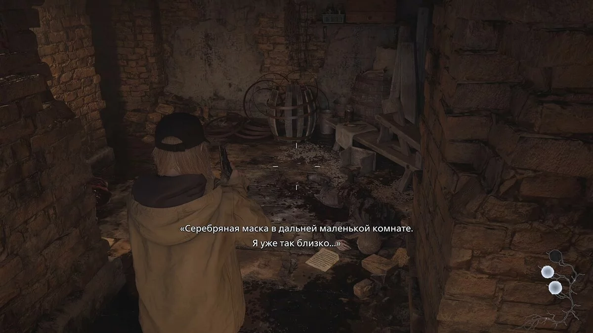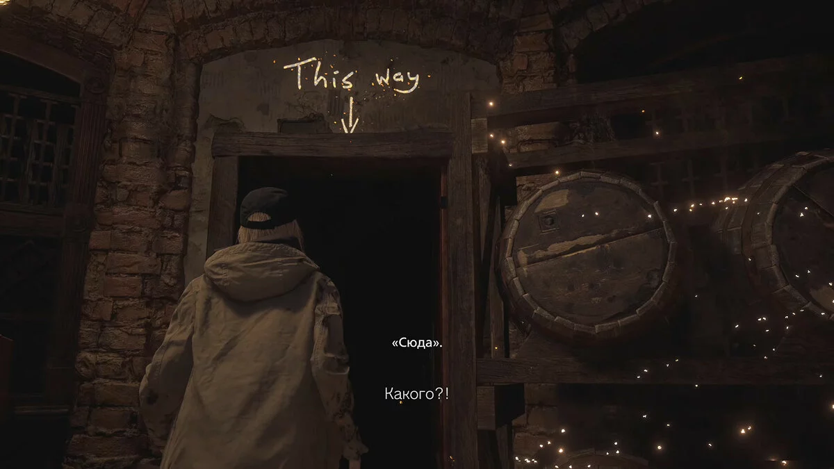 Добираемся до тупика и смотрим короткую кат-сцену. Двигаемся по узкому туннелю вперёд и следуем за золотистыми символами и линиями, которые подскажут путь. В следующей комнате бочки отодвинутся в сторону и откроется путь дальше. Добираемся по узким коридорам до небольшой комнаты, пролезаем через туннель и оказываемся в старинном доме.