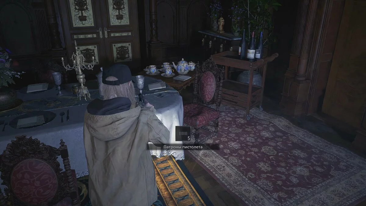 Через двойную коричневую дверь попадаем в столовую. Дробовик забрать пока не получится, однако на столе можно найти патроны пистолета.