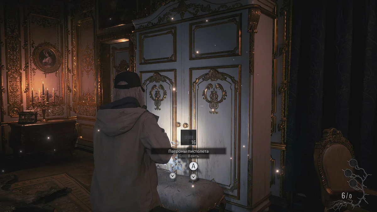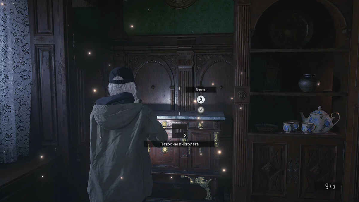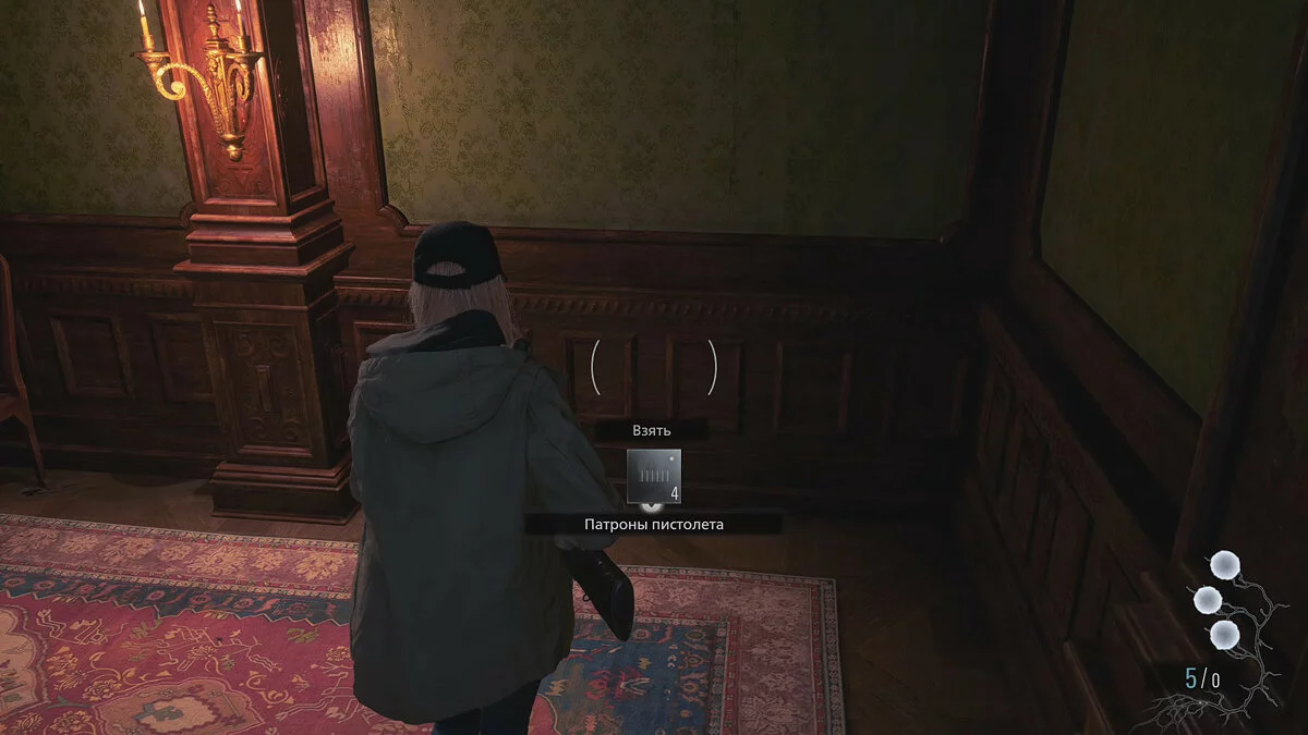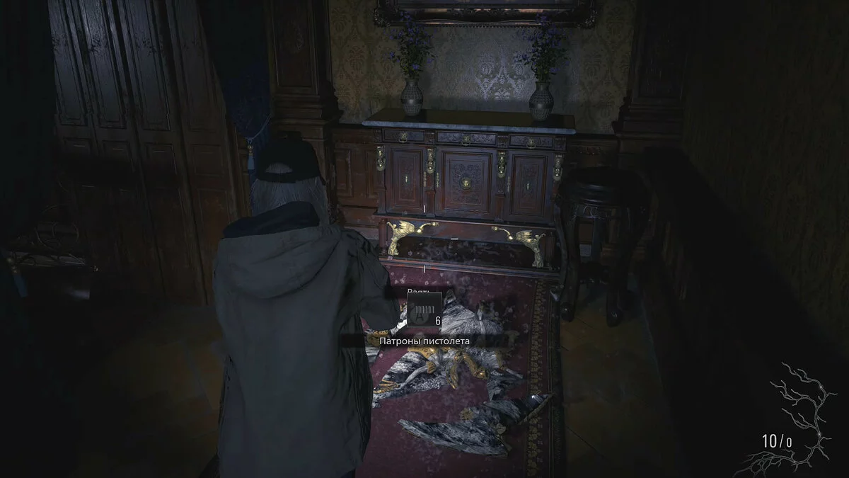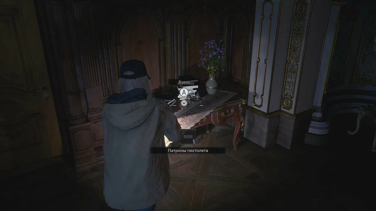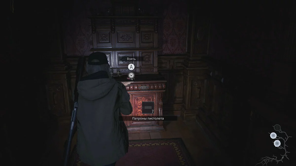 Подходим к золотым буквам на стене. На комоде появятся патроны пистолета.