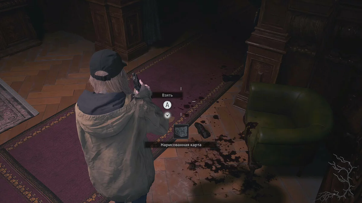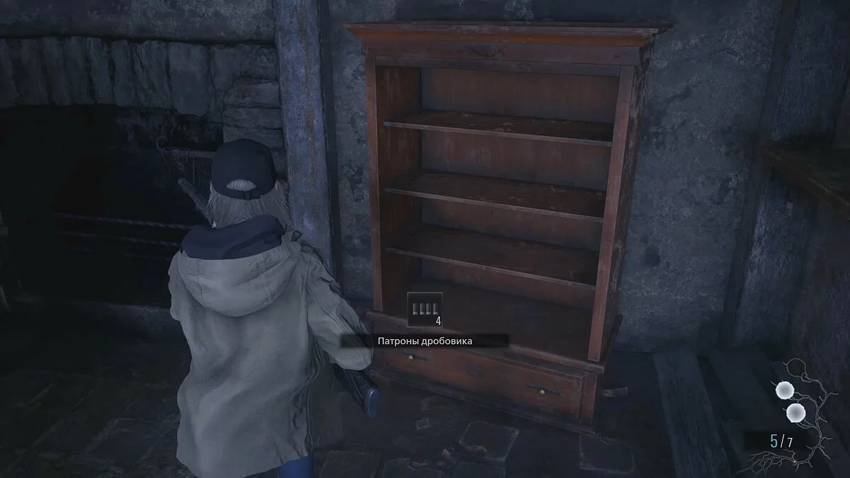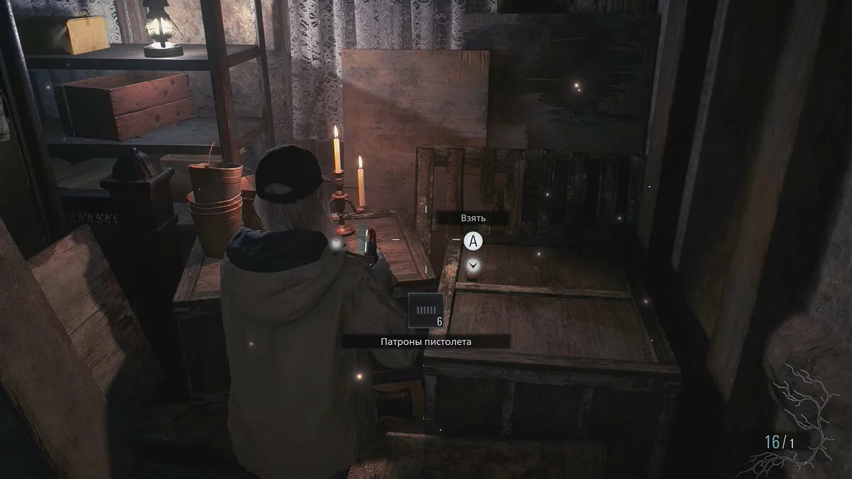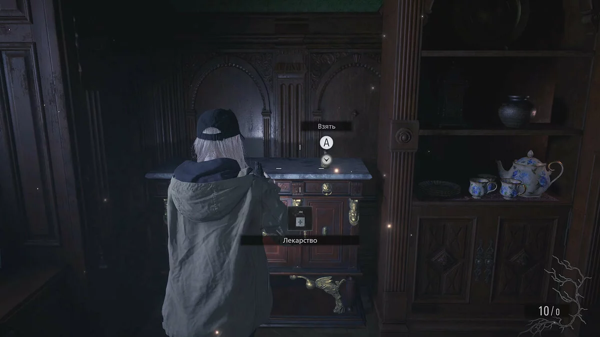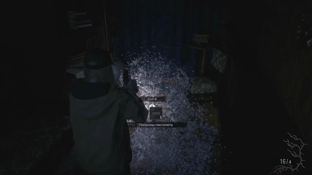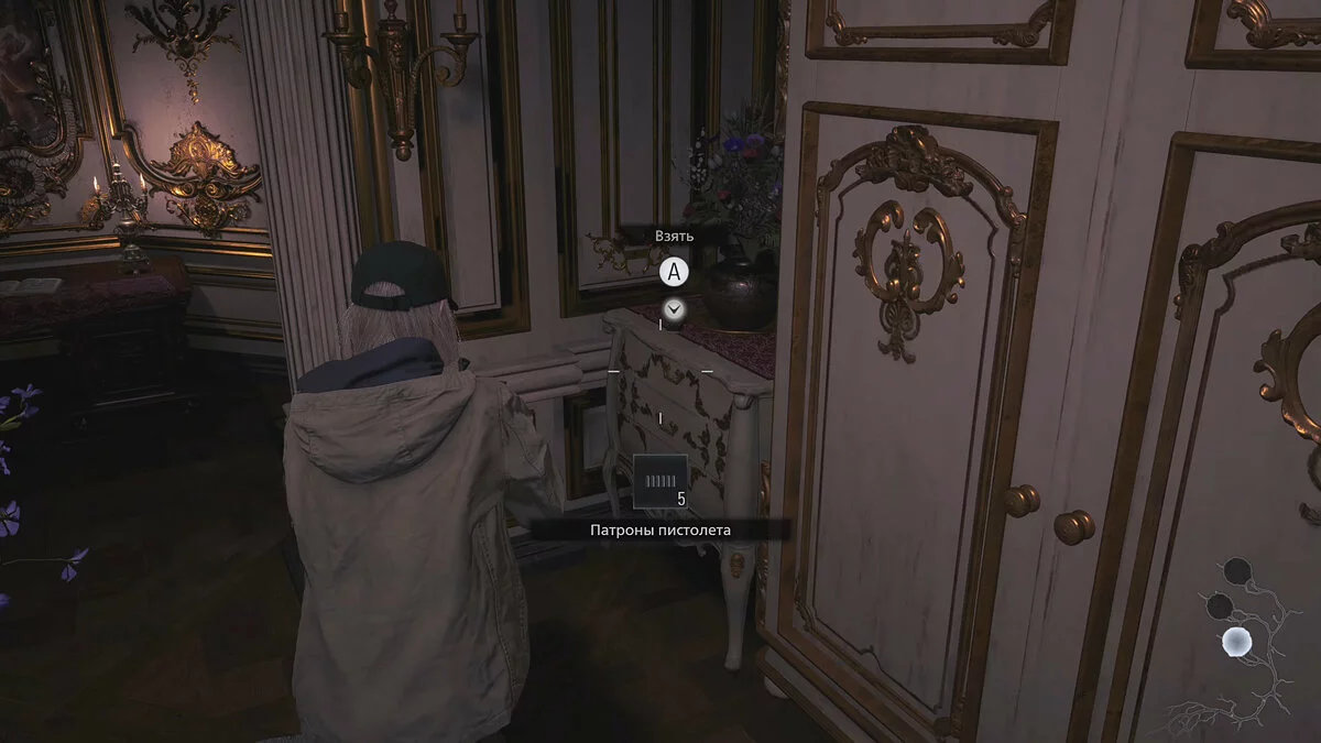 Подходим к золотым буквам на стене. На комоде появятся патроны пистолета.