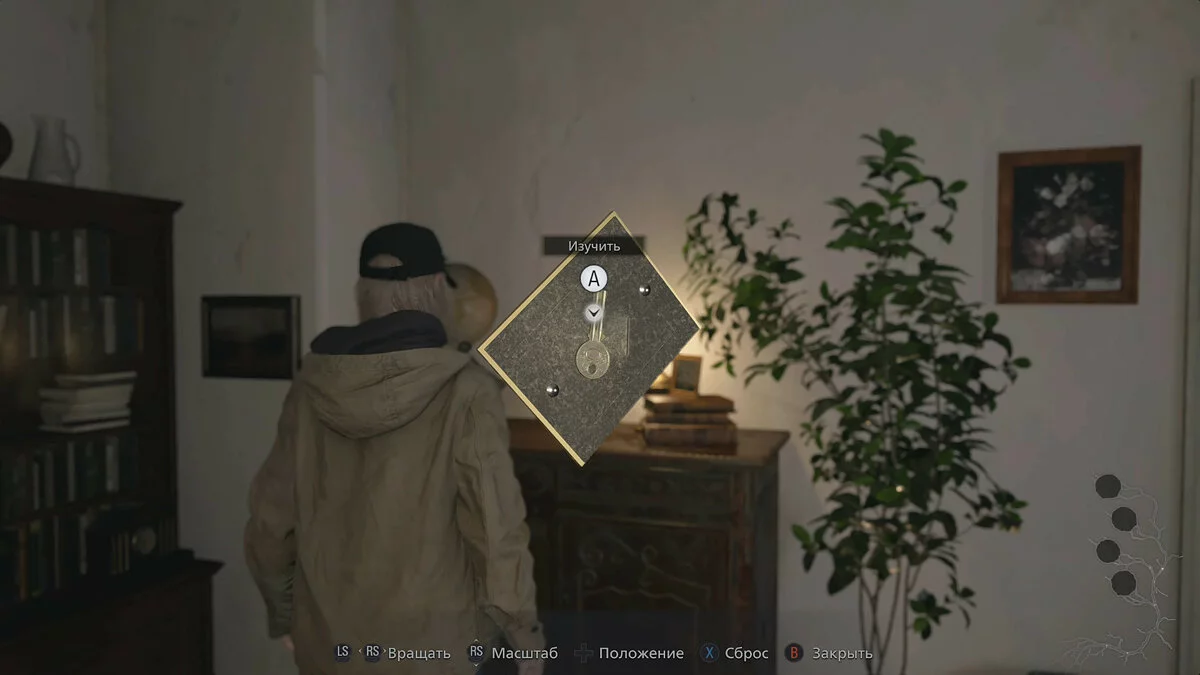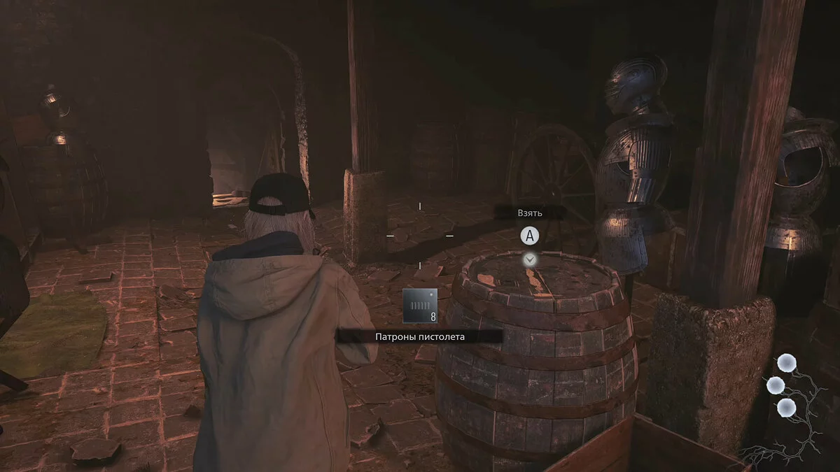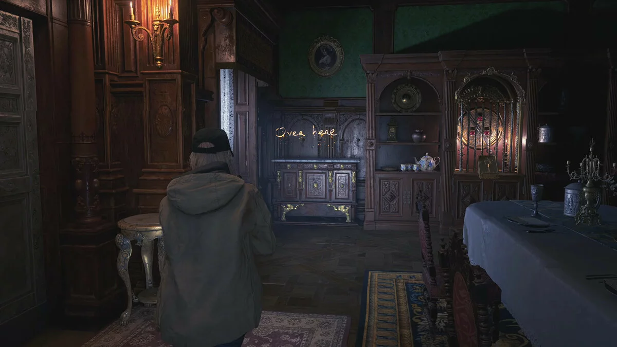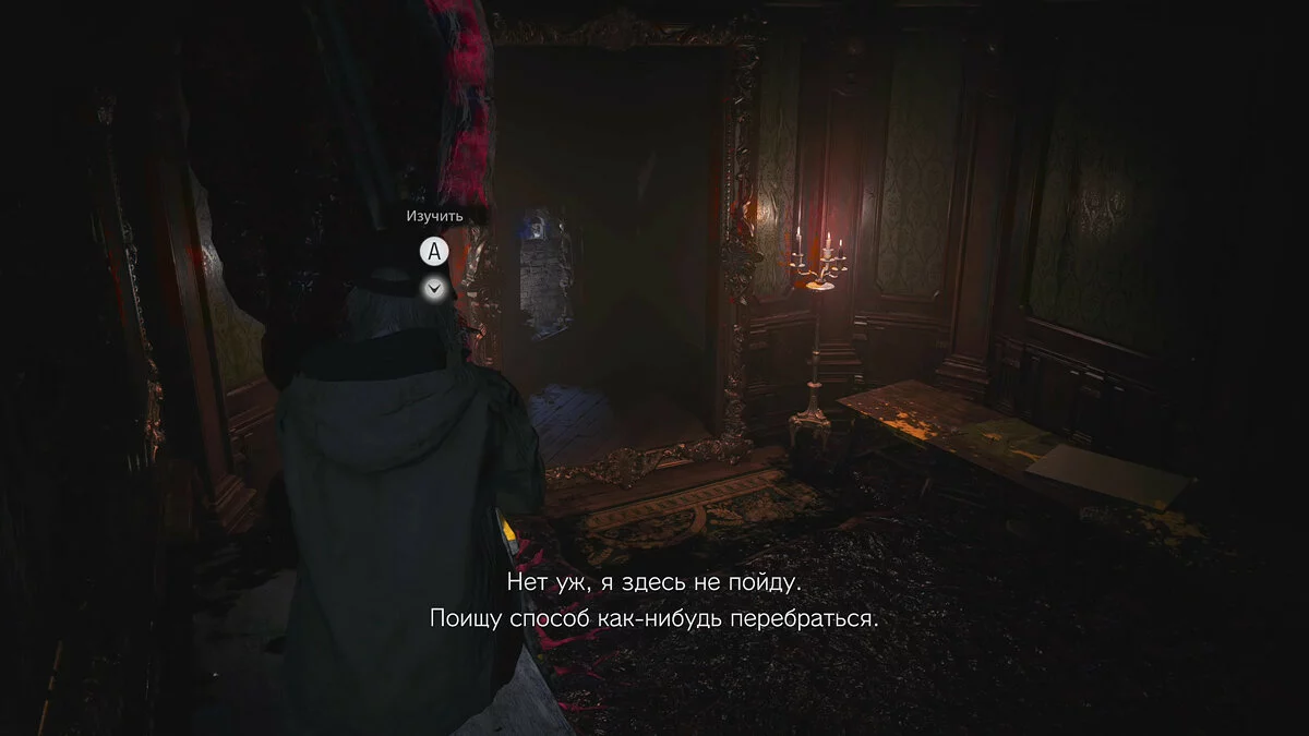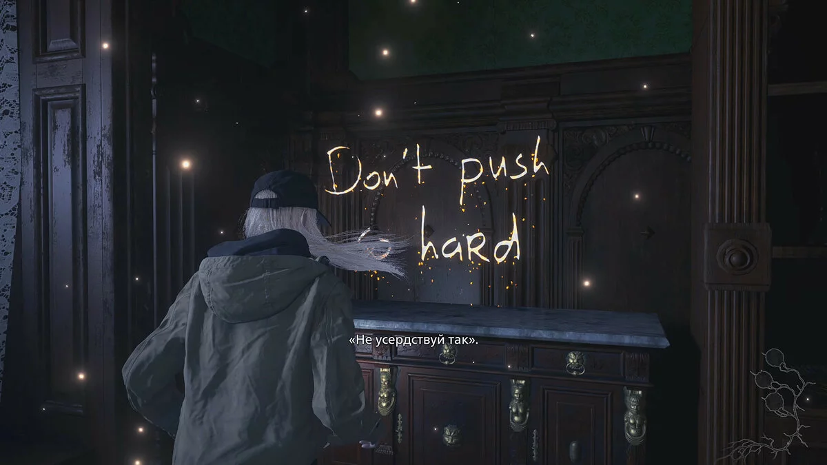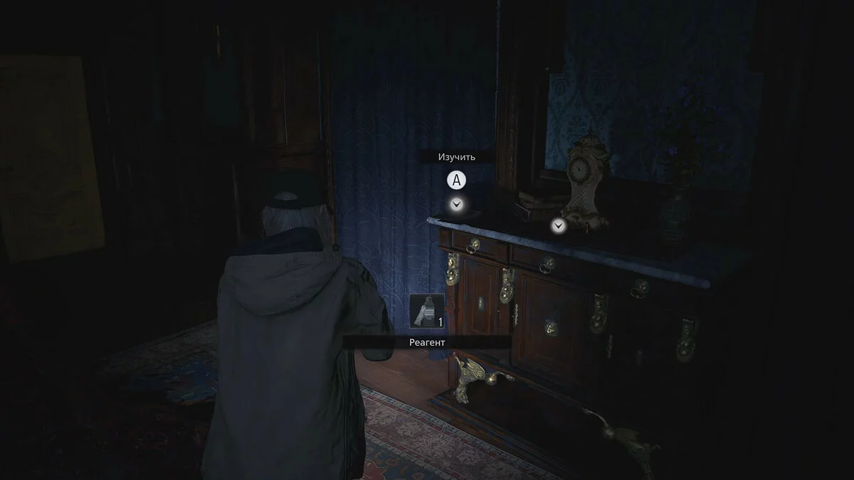 Подходим к золотым буквам на стене. На комоде появятся патроны пистолета.