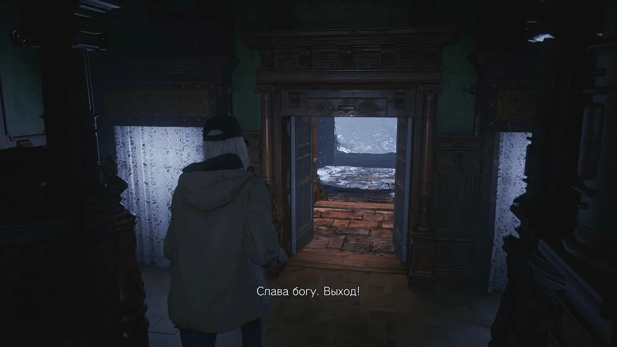 Смотрим кат-сцену, в которой героиня познакомится с Мирандой. Убегаем вместе с Итаном от врага. Мужчина поможет убивать демонов на пути. Следуем на свет и выходим на улицу.