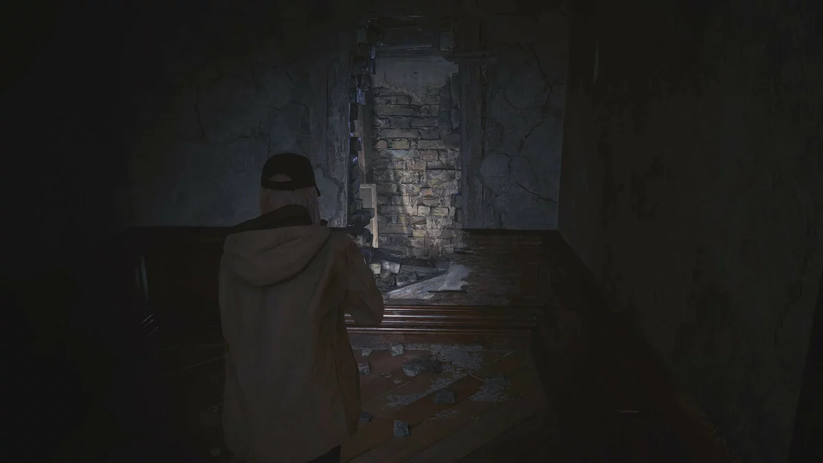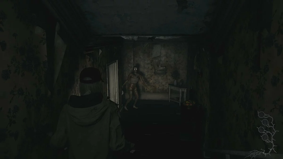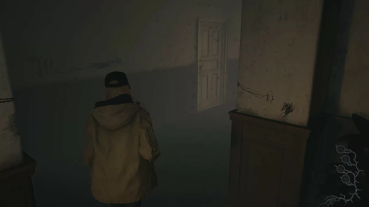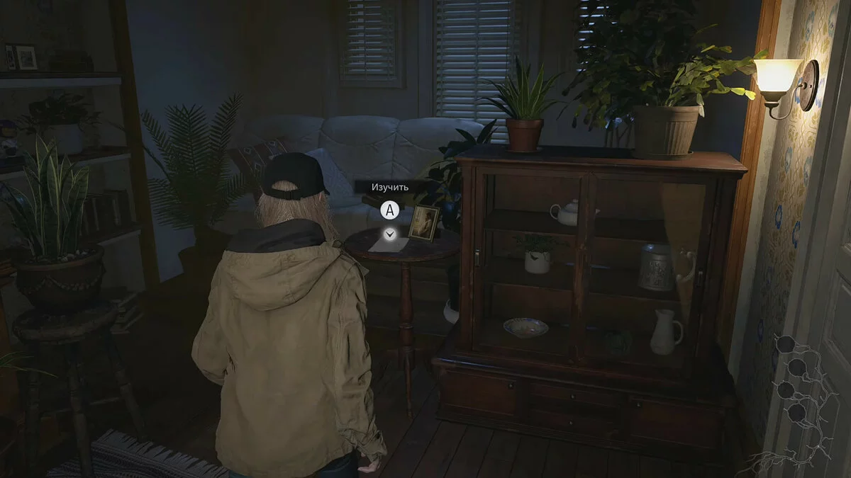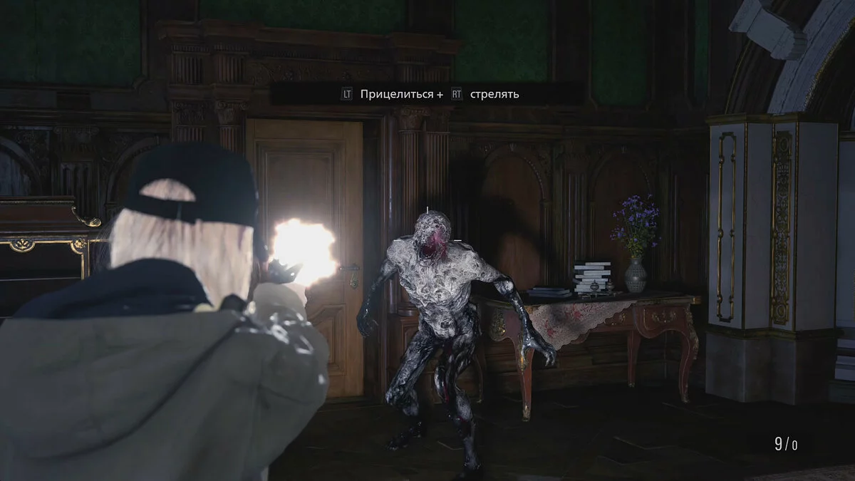 Спускаемся по лестнице, сворачиваем налево и проходим мимо цветка в следующую комнату. Поднимаемся по лестнице, идём через жёлтую дверь и пытаемся выйти наружу из дома. Путь будет преграждён, поэтому возвращаемся обратно и наблюдаем за очередной кат-сценой. Получаем пистолет и сразу же стреляем противнику в голову.