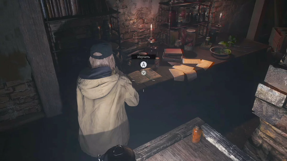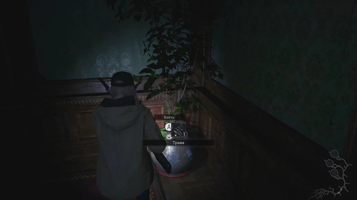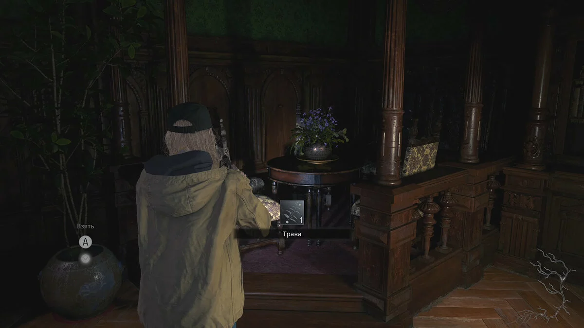 Забираем порох с комода и изучаем заметки на другом столе. Слева в кувшине находим траву.