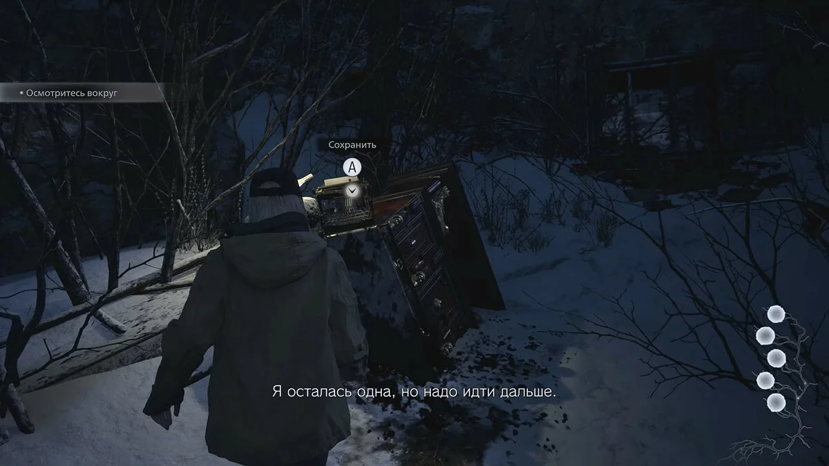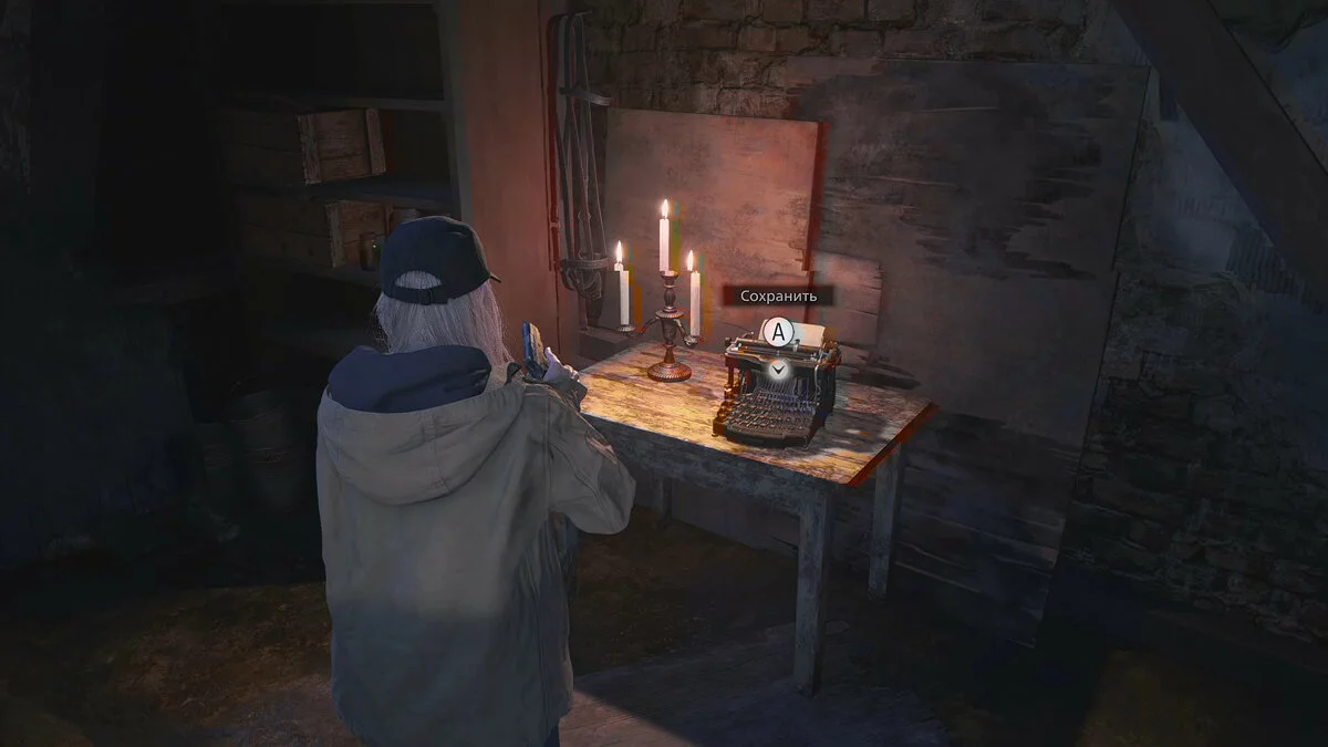 После кат-сцены активируем печатную машинку для сохранения. Двигаемся вперёд, осматриваем дверь и забираем патроны пистолета. Немного дальше найдём ещё одну пачку патронов пистолета. По тропе выходим в деревню.