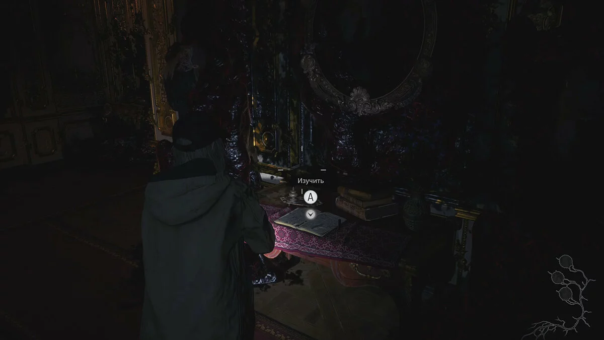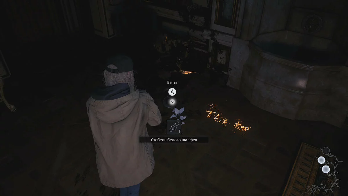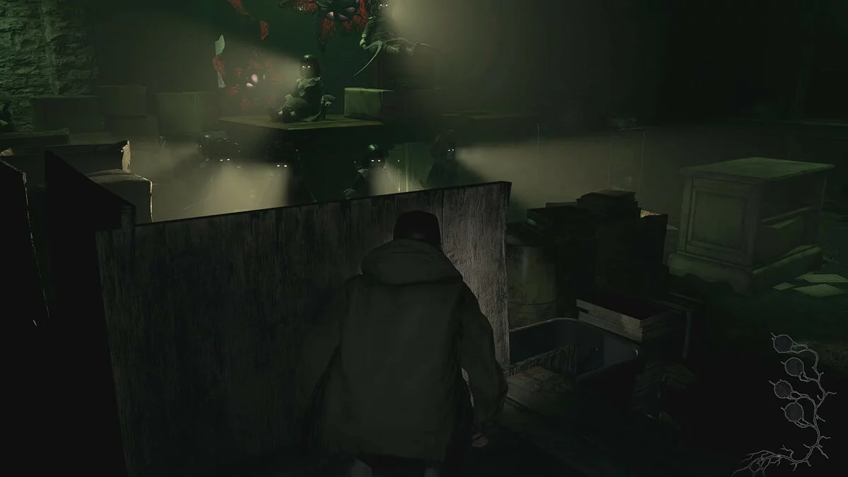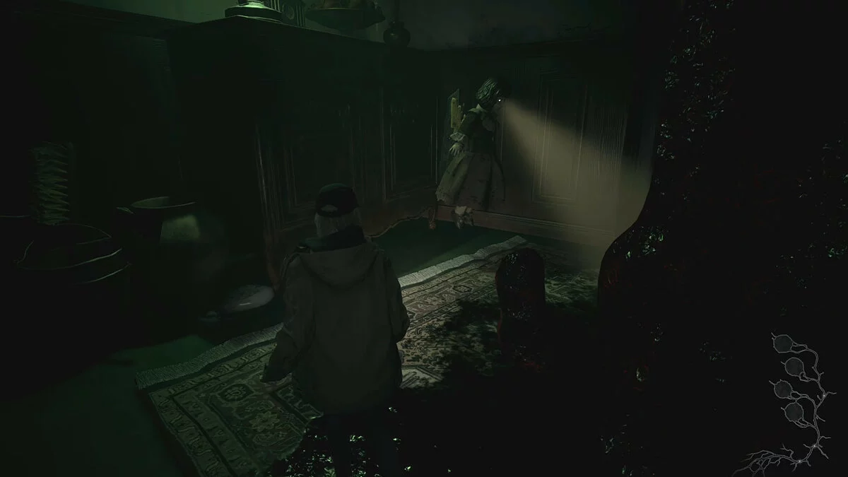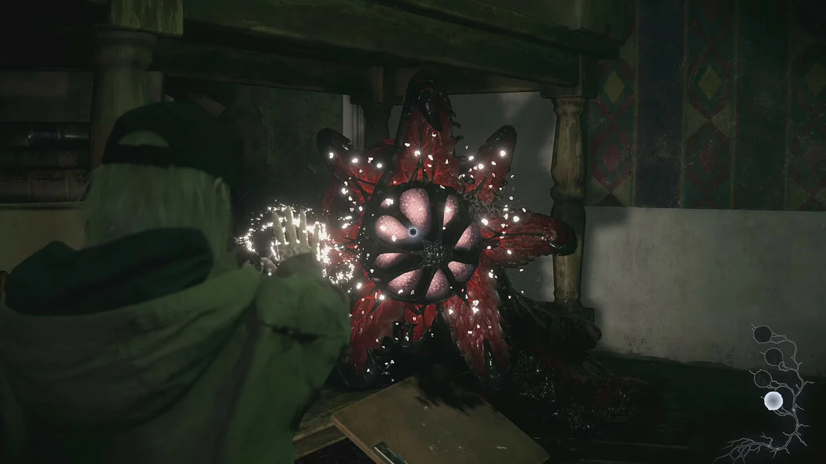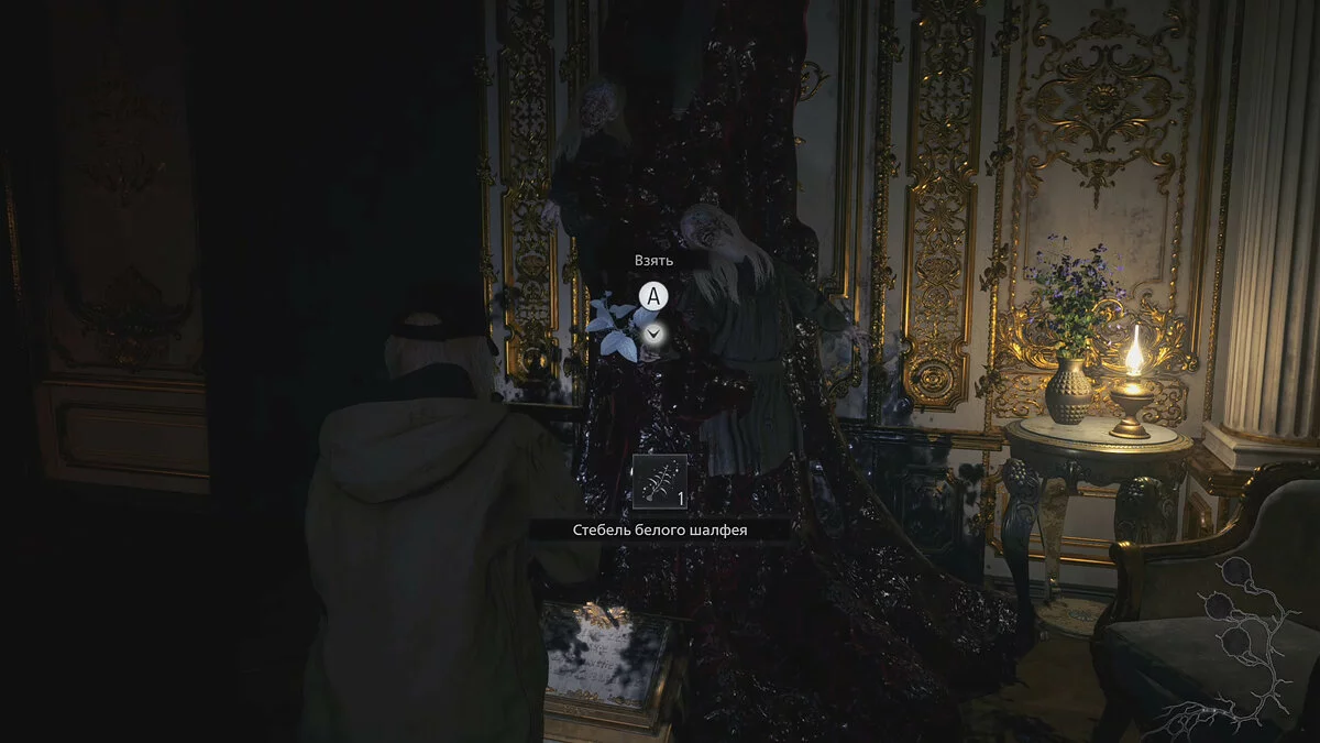 Как только куклы отвернутся, добегаем до безопасной зоны и разрушаем цветок. Обходим стол и уничтожаем ещё один сгусток. В следующей комнате прячемся под столом от манекена.