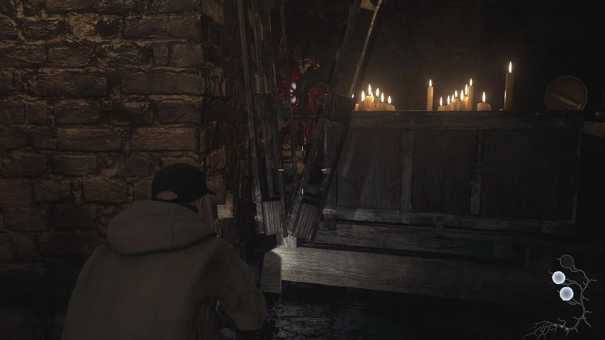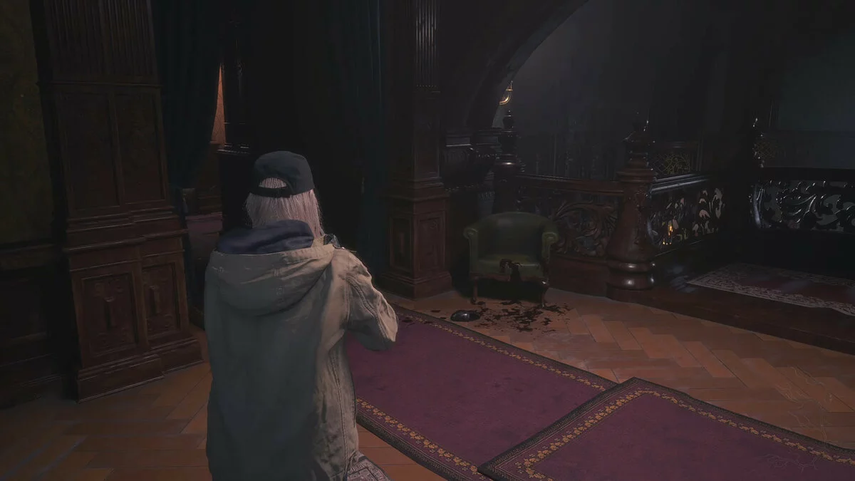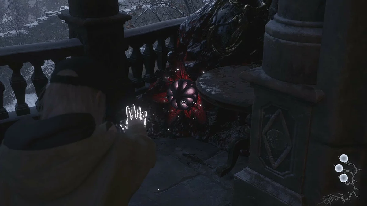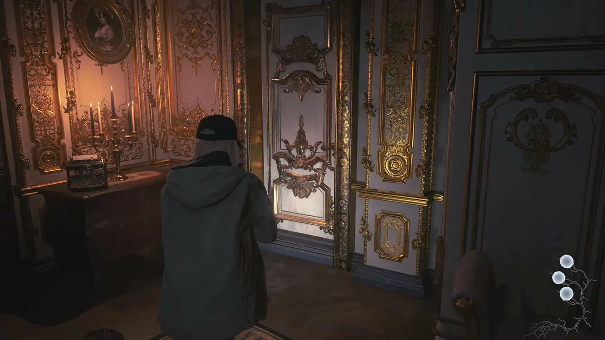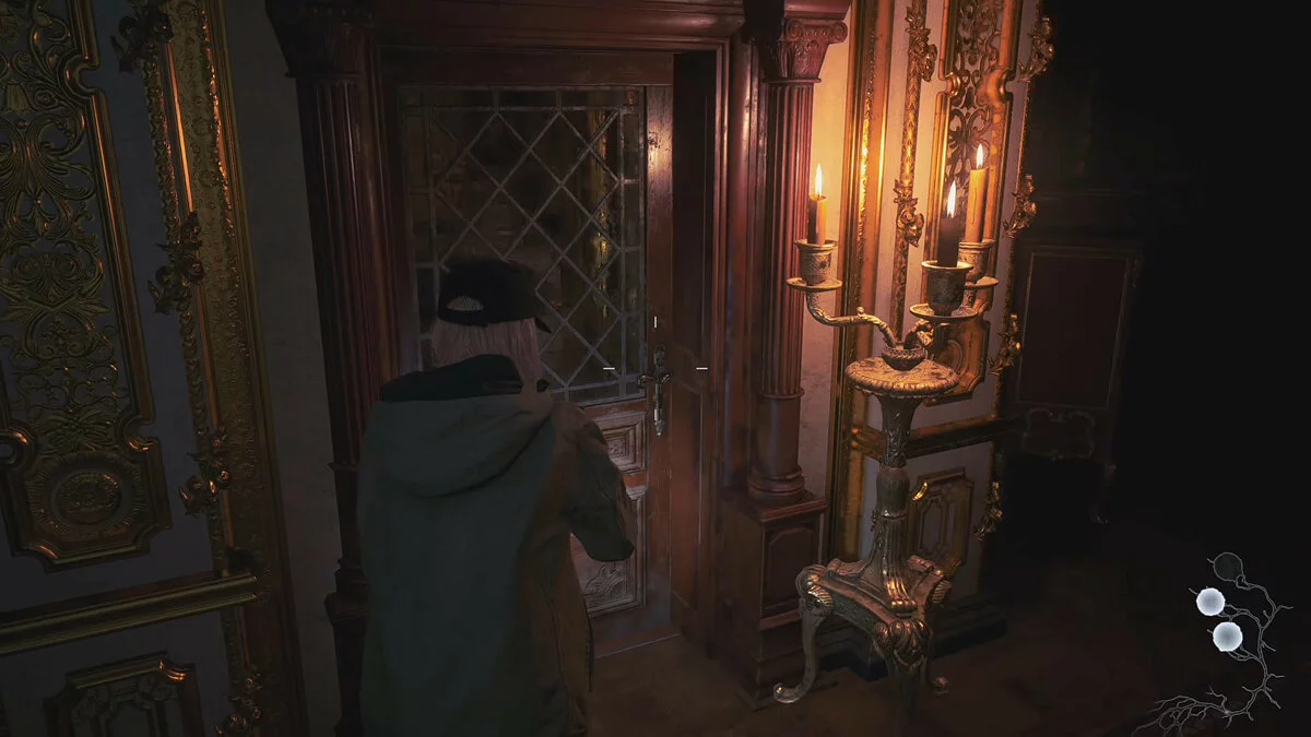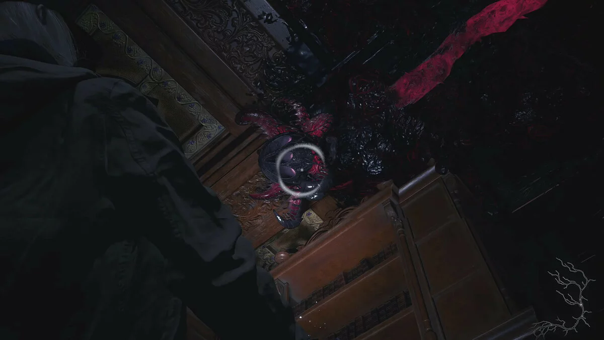 Как только куклы отвернутся, добегаем до безопасной зоны и разрушаем цветок. Обходим стол и уничтожаем ещё один сгусток. В следующей комнате прячемся под столом от манекена.