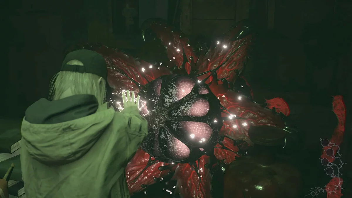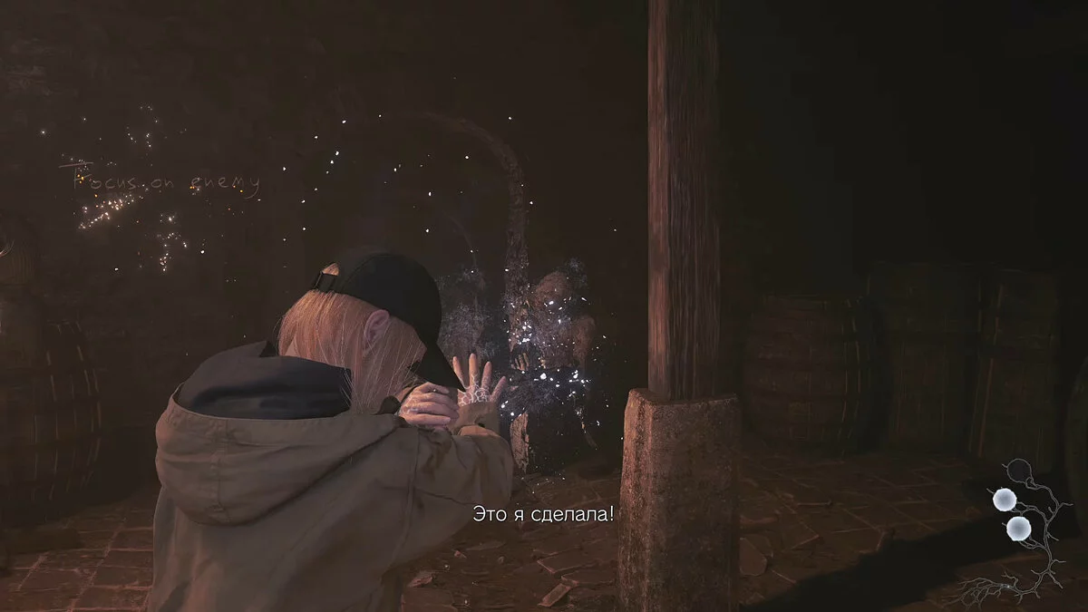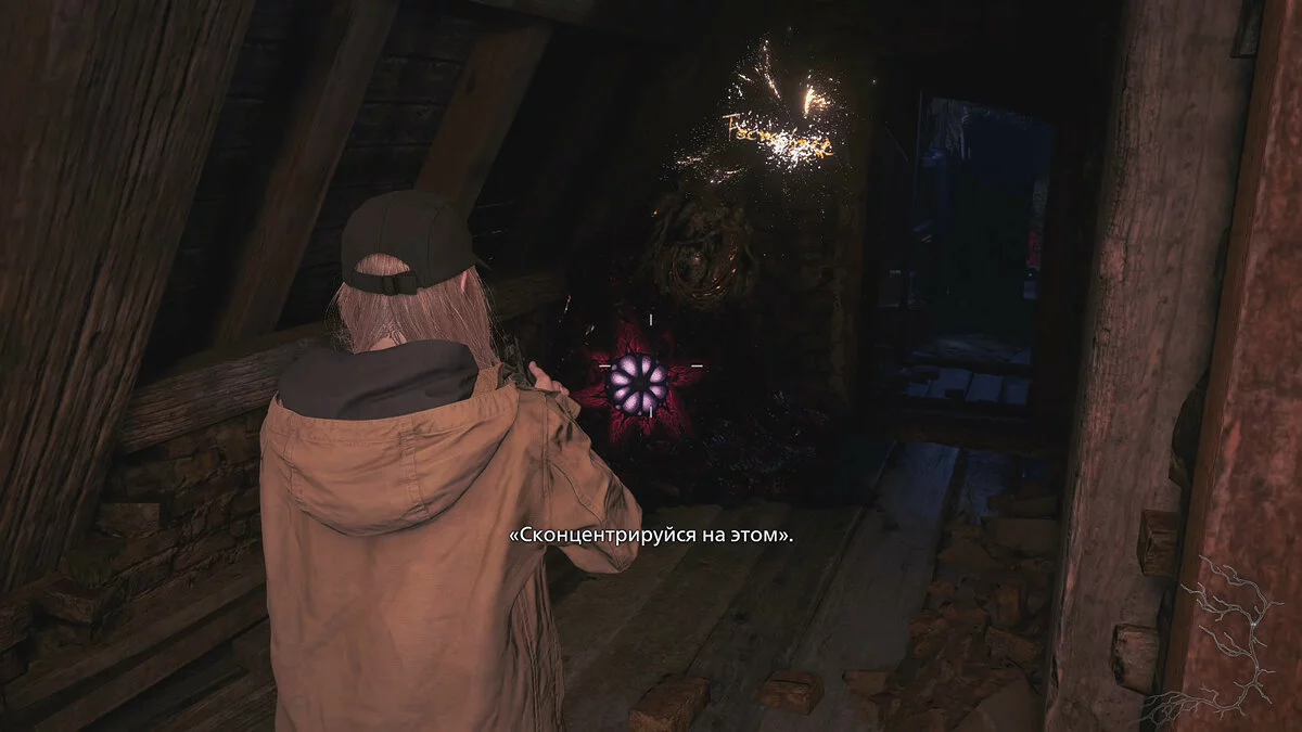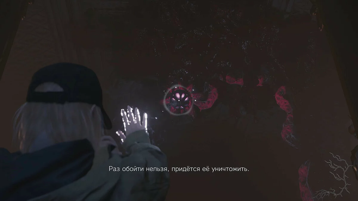 В следующей комнате в битве с Эвелиной прячемся за предметами и, как только её набор атак будет завершён, сразу же применяем свою силу против девочки. После трёх попаданий разрушаем два сгустка.