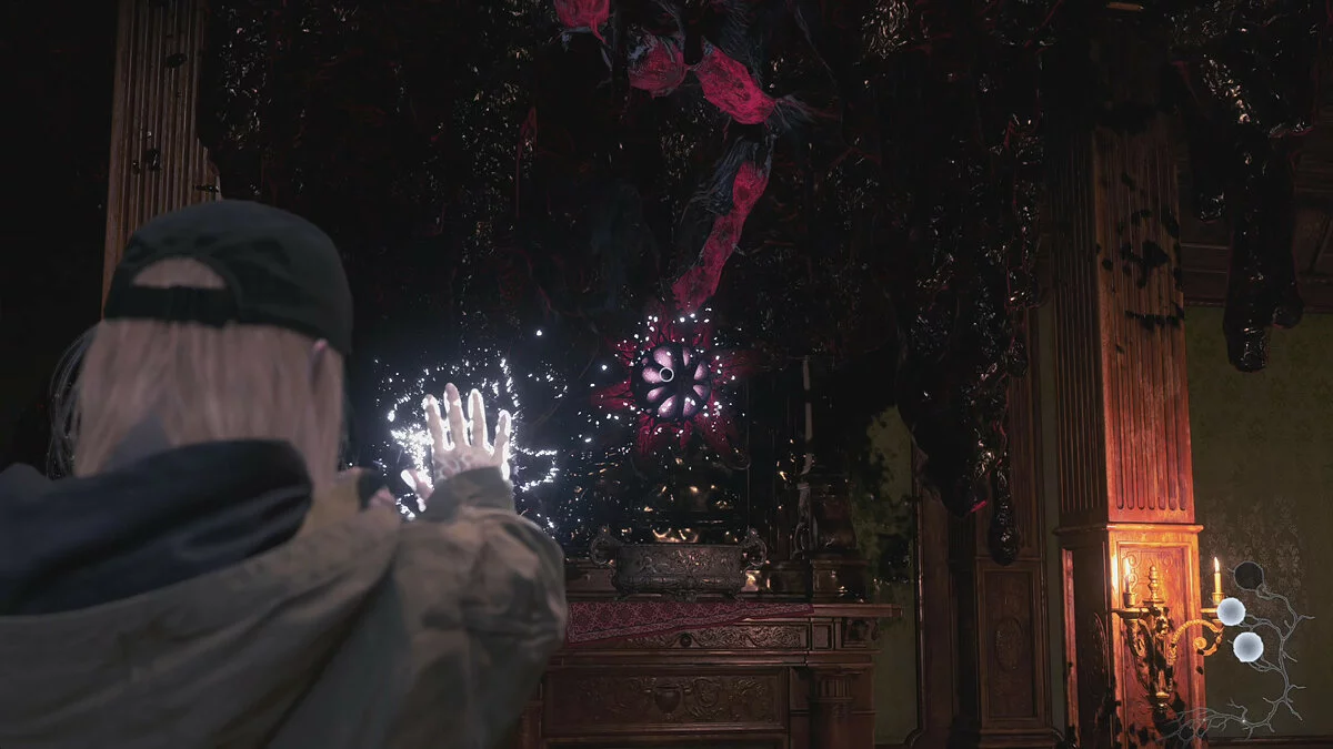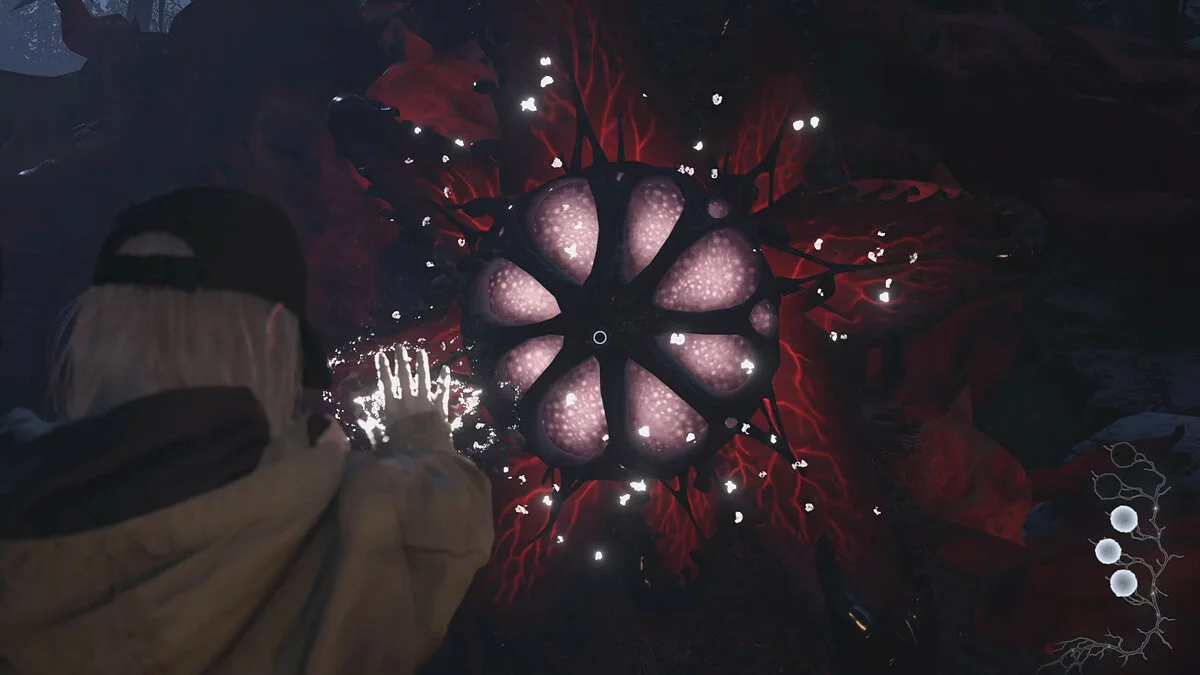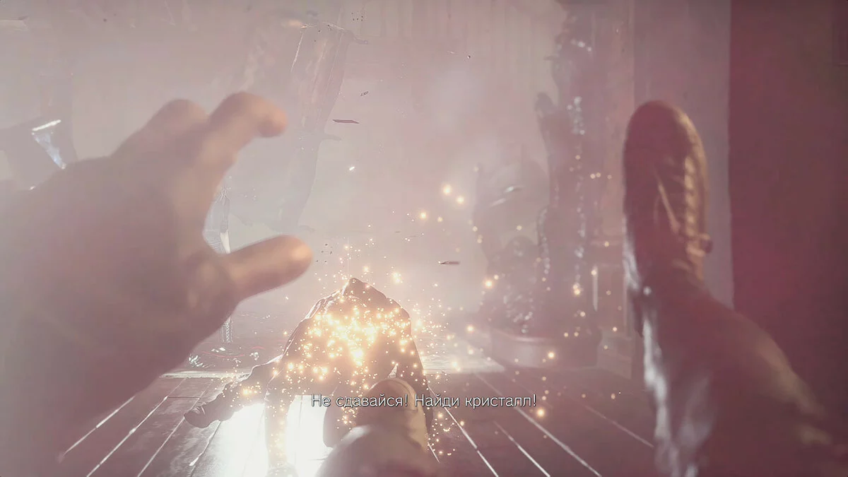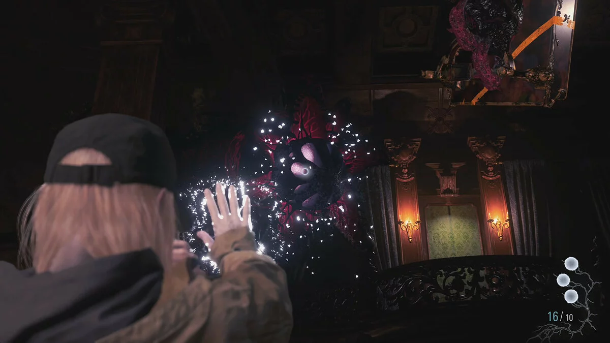 В следующей комнате в битве с Эвелиной прячемся за предметами и, как только её набор атак будет завершён, сразу же применяем свою силу против девочки. После трёх попаданий разрушаем два сгустка.