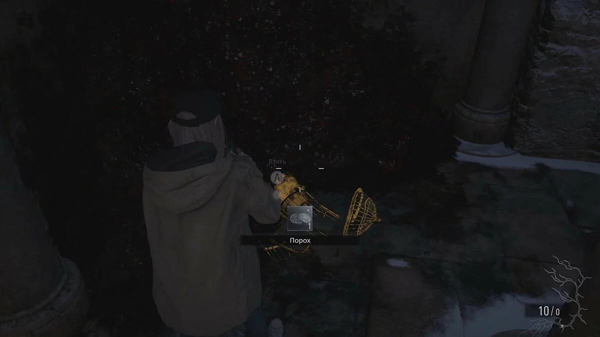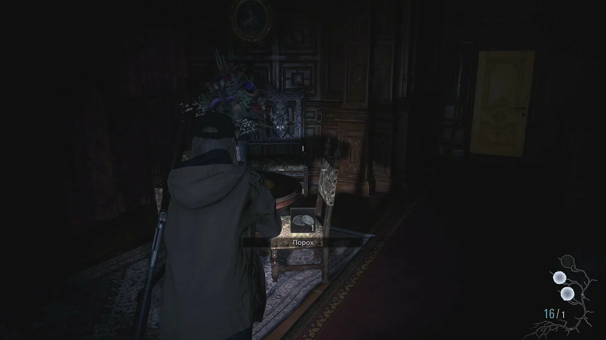 Поднимаемся по лестнице наверх и в комнате перед кухней собираем патроны дробовика, порох и реагент.