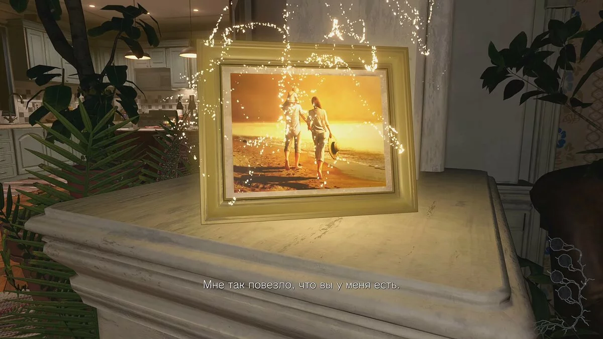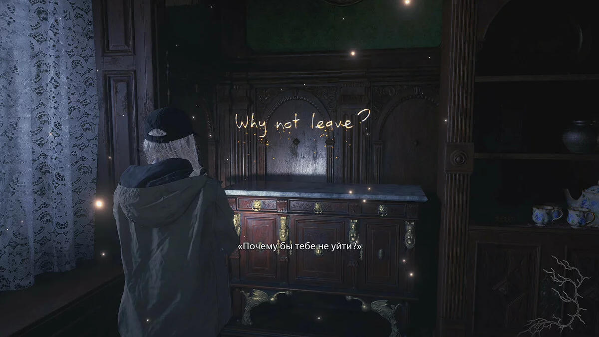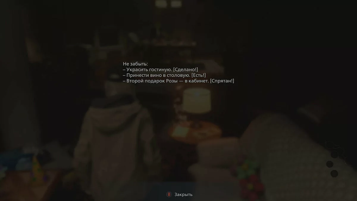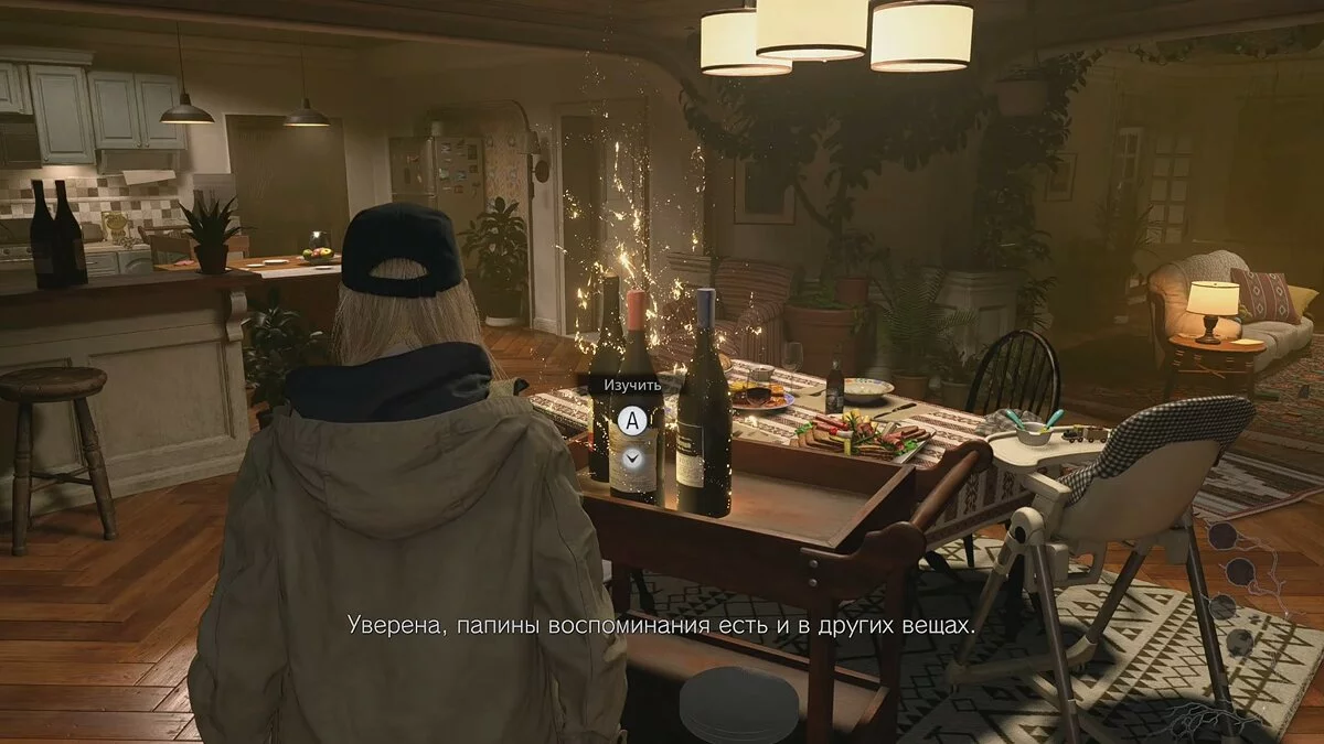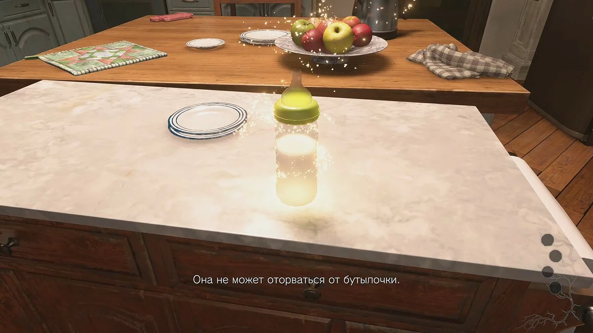После разговора осматриваем подсвеченные предметы — заметку на круглом столе, фотографию в рамке, вино и бутылочку с молоком.