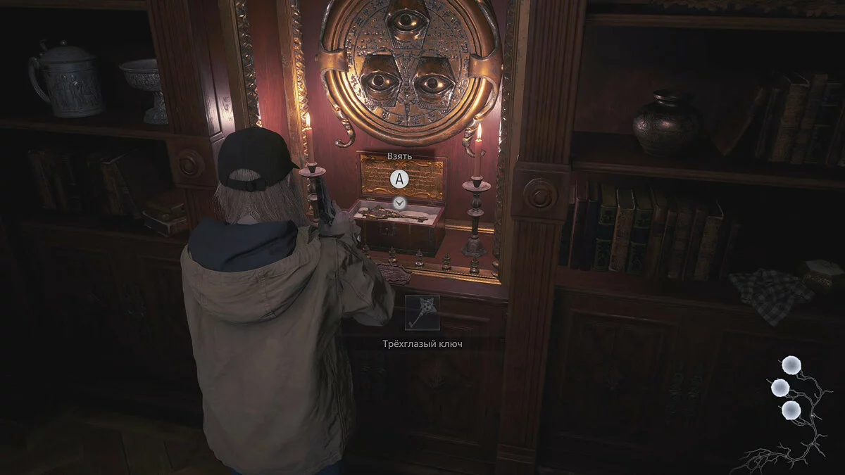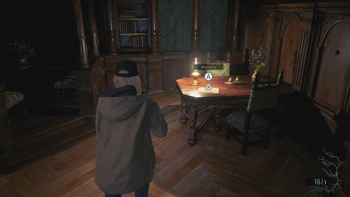 Проходим в открывшуюся комнату справа. На тумбочке справа забираем патроны пистолета, а на столе изучаем книгу и забираем одноглазый ключ.