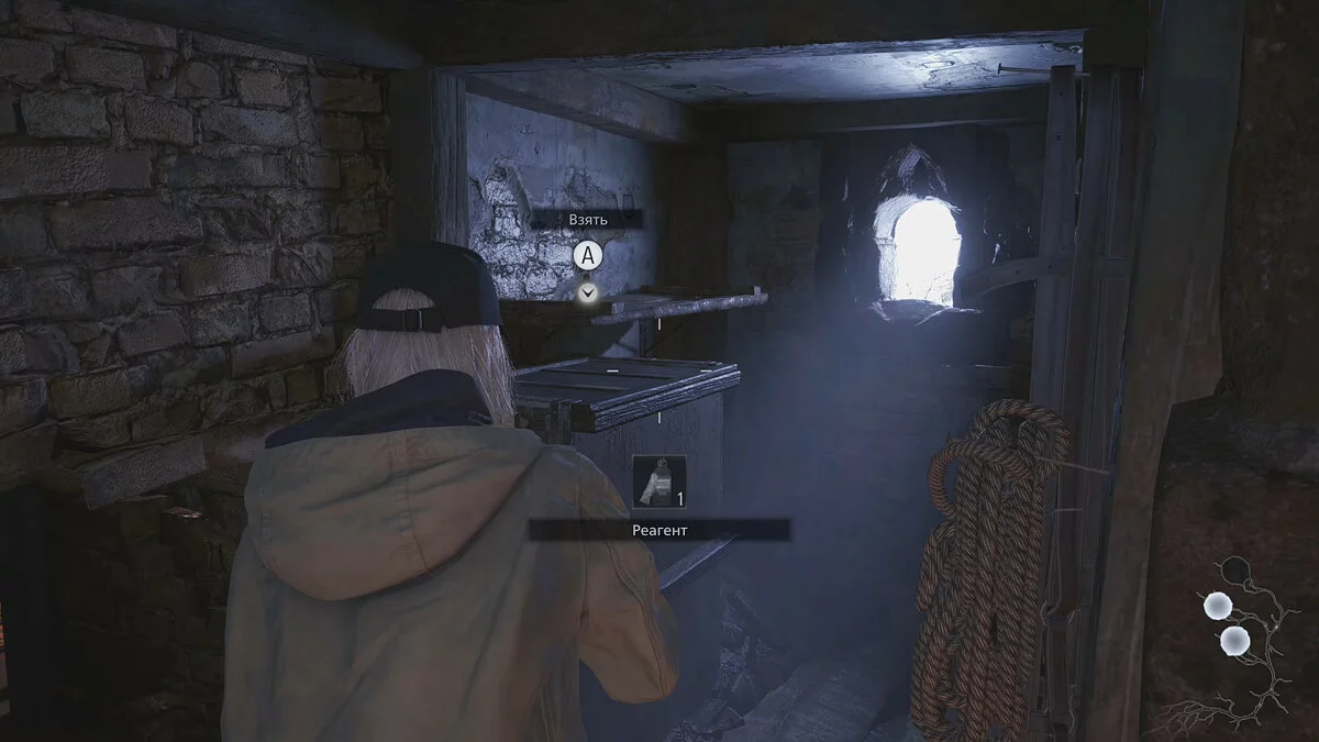 Спускаемся по лестнице и хватаем реагент справа с коробки.