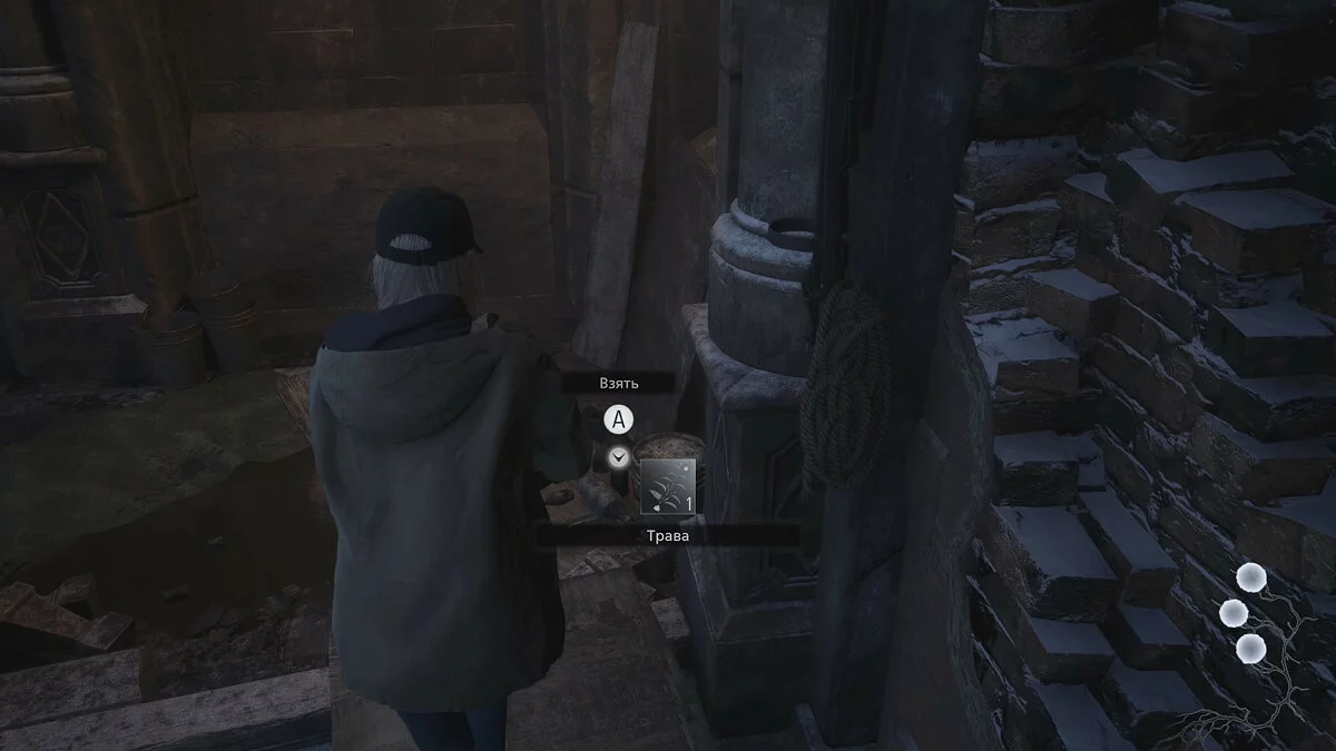 У ворот забираем пучок белого шалфея. Слева в кучке мусора находим лекарство.