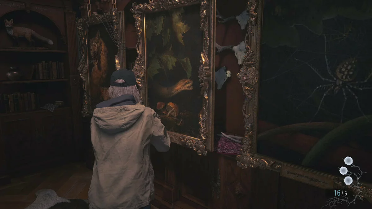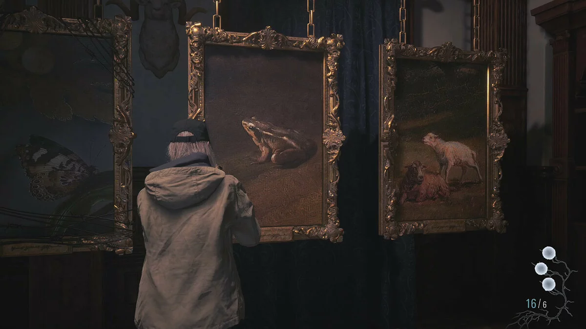 Здесь же проходим через жёлткую комнату и со столика забираем реагент. Осматриваем картины и при желании можем забрать изображения с лягушкой, овцой и пауком. На текущий момент Роуз не хватит одной картины, поэтому сейчас не имеет смысла расставлять их в правильном порядке. Обратите внимание, что волк и бабочка крепко закреплены — сдвинуть их не получится.