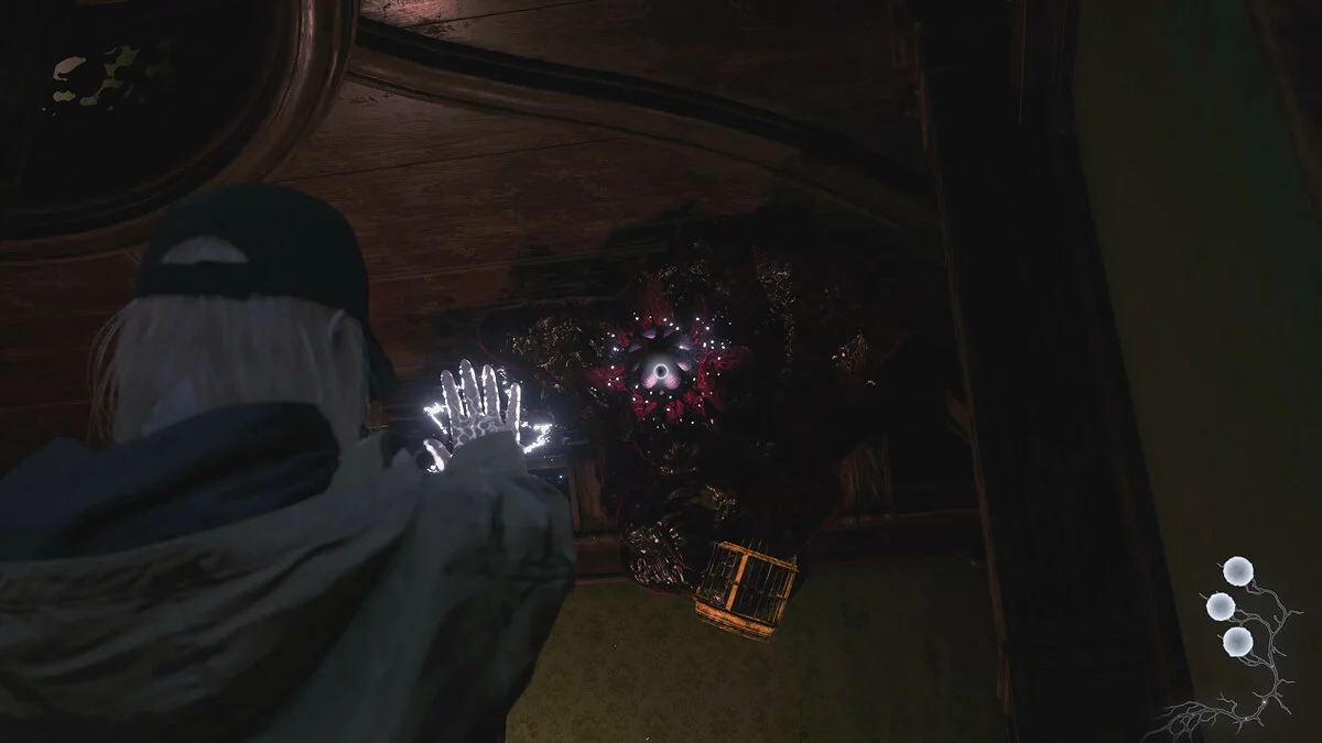 Поднимаемся по лестнице и сворачиваем налево. В следующей комнате находим пучок белого шалфея. Уничтожаем кукол и идём дальше. Убегаем от манекенов, применяем силу на сгустки и добегаем до лифта. Поднимаемся наверх.