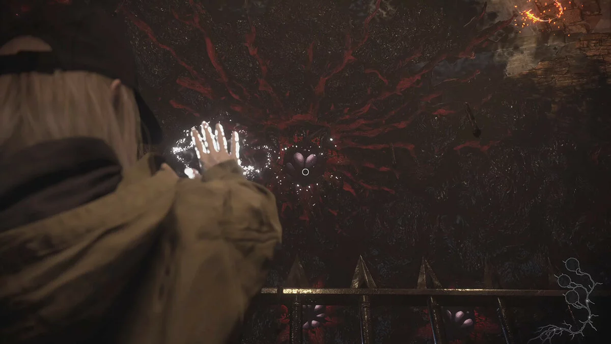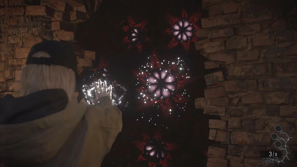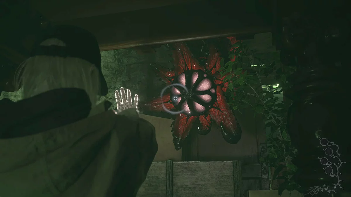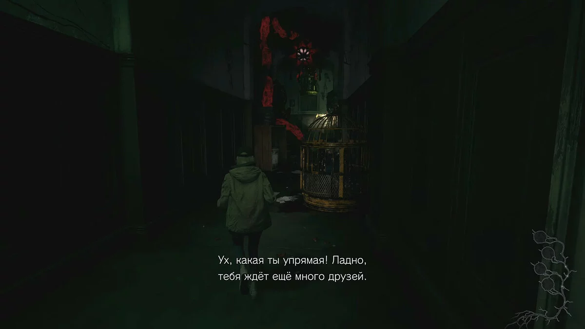 Проходим по коридору и прячемся от кукол. Поднимаемся на второй уровень, добираемся до растения и разрушаем его.