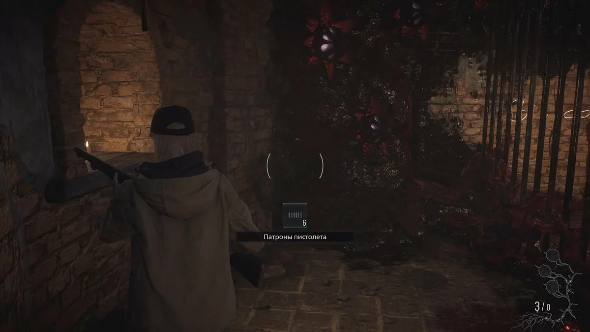 Выходим из комнаты, двигаемся направо и в тупике уничтожаем цветок. Забираем патроны пистолета.