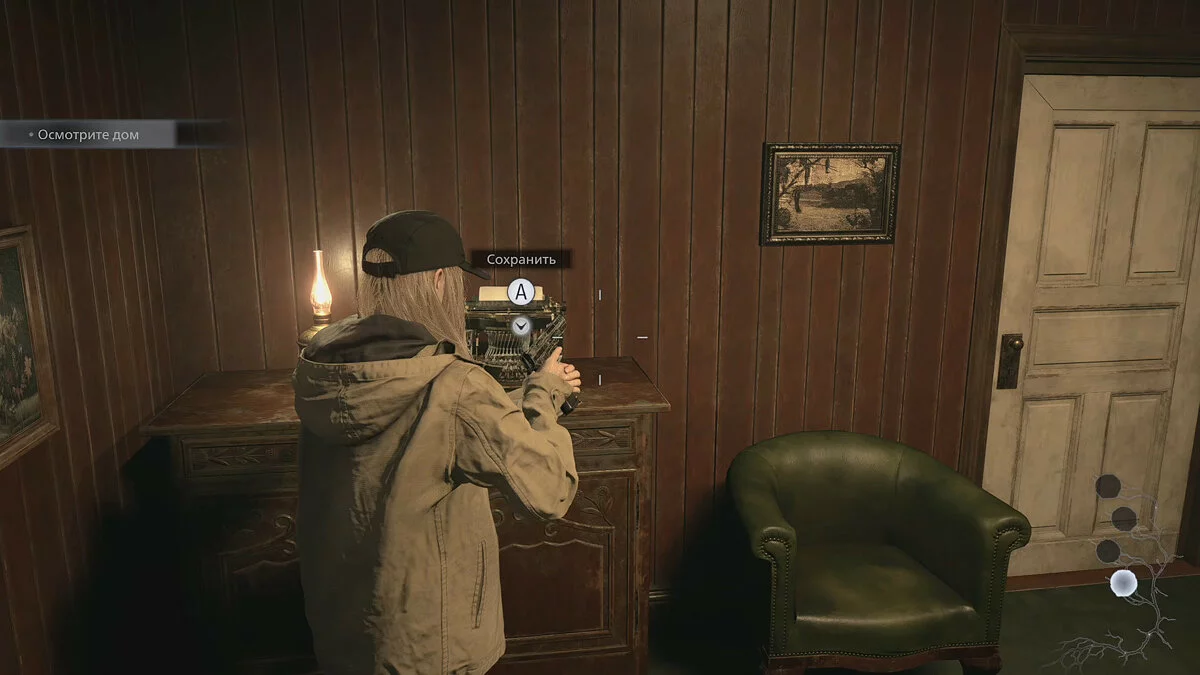 Заходим в дом, активируем лифт и поднимаемся наверх. На выходе используем печатную машинку и изучаем заметки в книге.