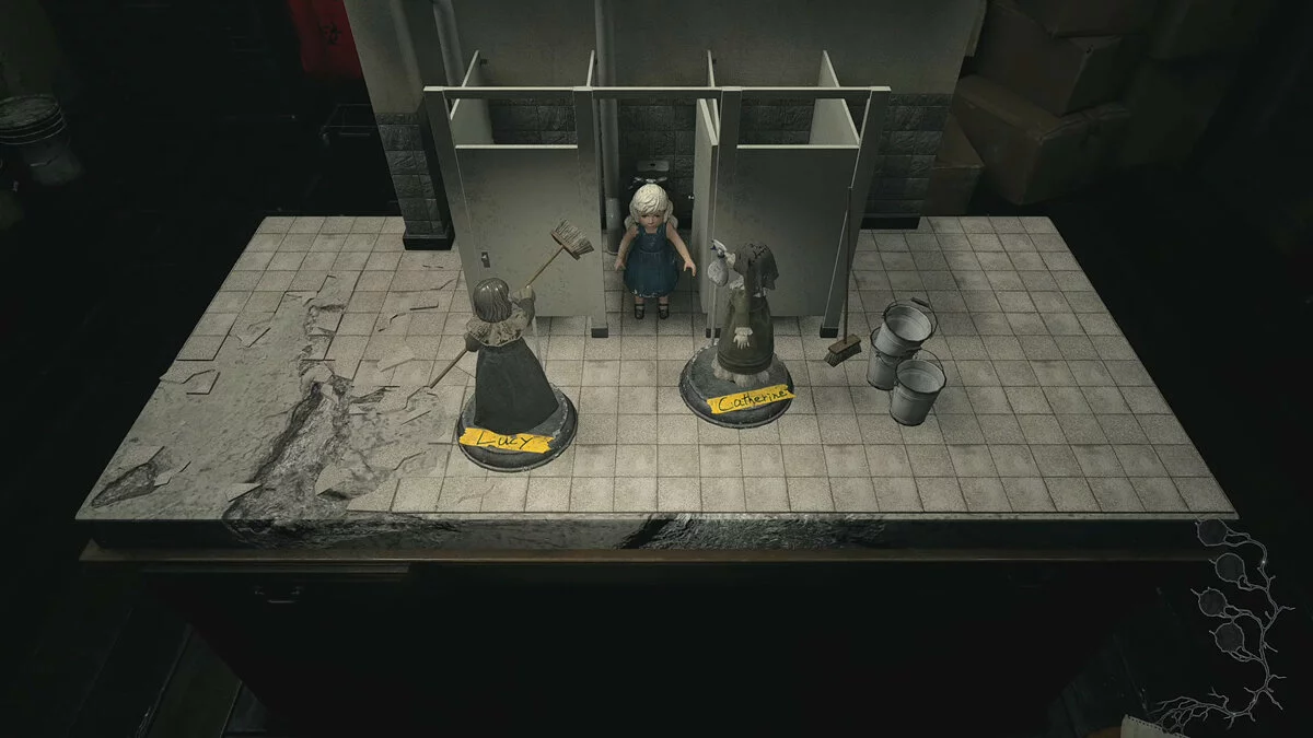 Используем печатную машинку для сохранения и изучаем заметку. Пролезаем в проём и выходим с другой стороны. В этой части игры куклы будут пытаться найти героиню и убить. Не попадаем в поле видения противников.