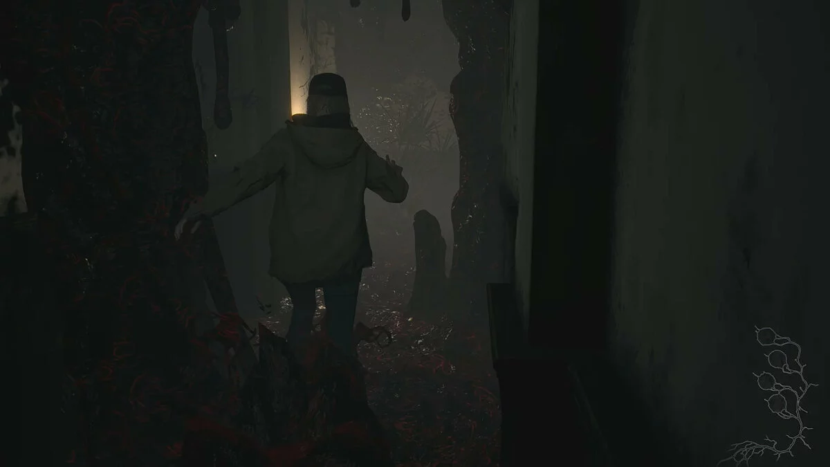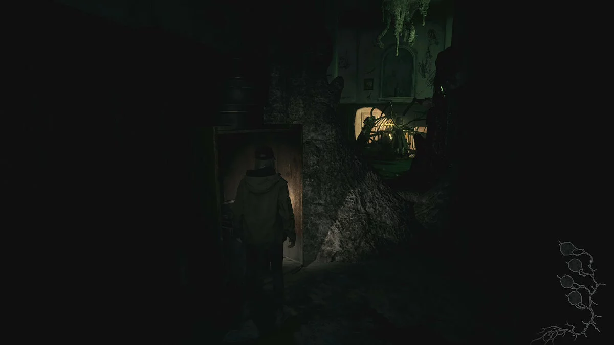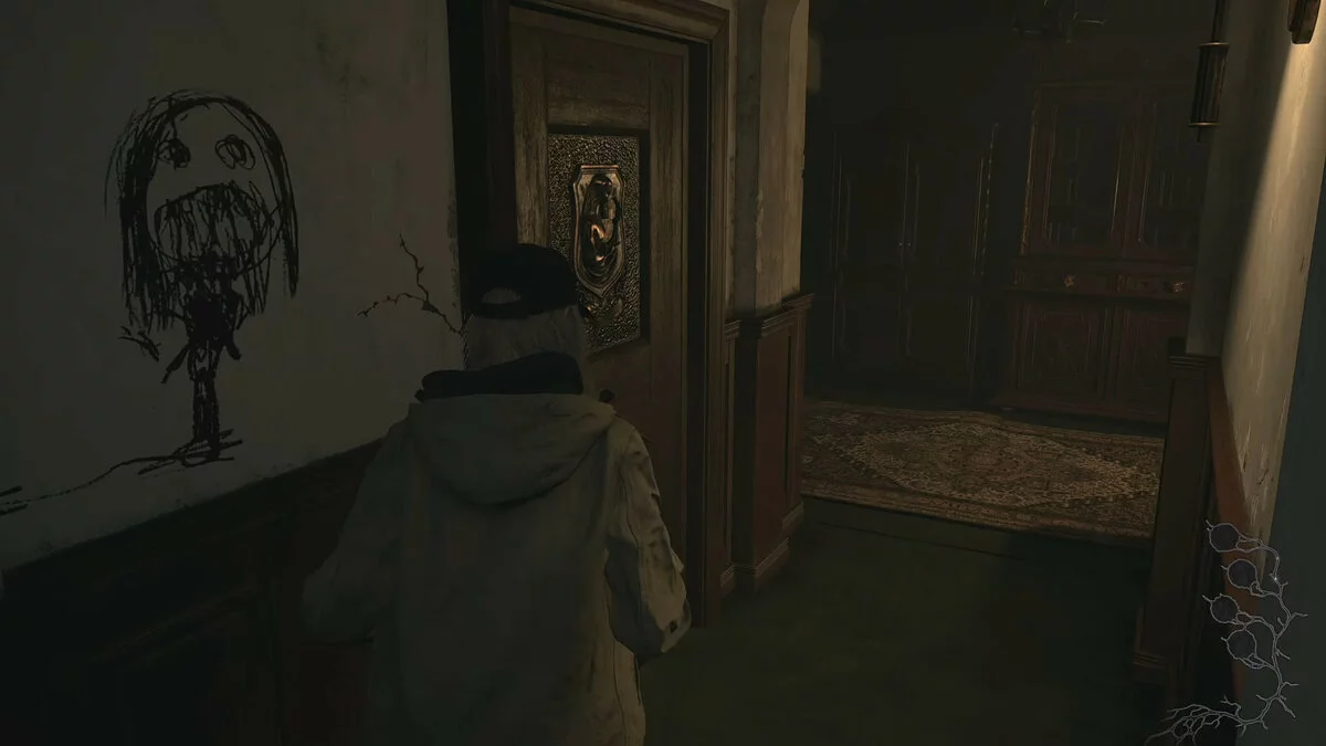 После осмотра дома возвращаемся в коридор перед галереей. Разрушаем цветок на потолке и через жёлтую дверь справа убегаем от монстра. Двигаемся по коридору и через ещё одну дверь попадаем в безопасную зону.