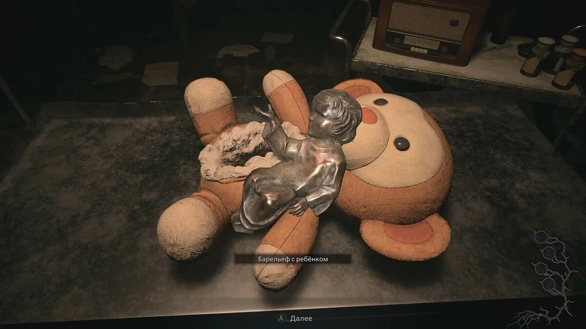 Внутри найдём ножницы. Возвращаемся обратно к игрушке и при помощи найденного предмета разрезаем швы. Внутри найдём барельеф с ребёнком.