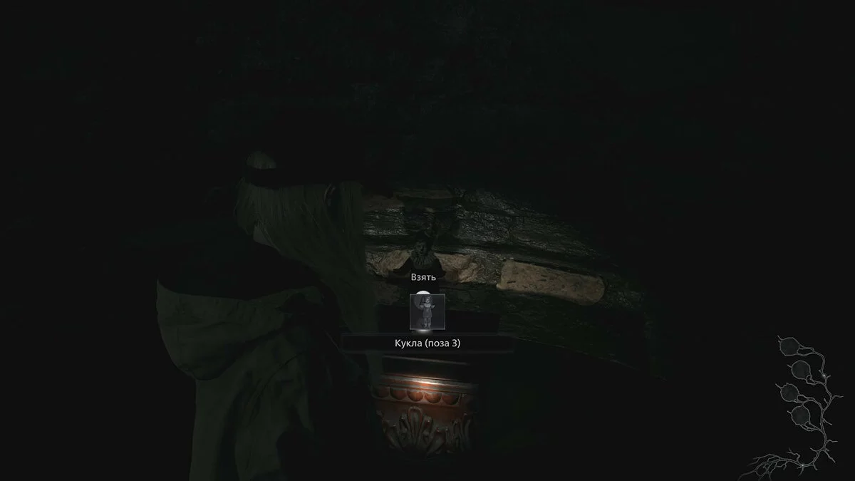 Выходим через большие коричневые двери и по коридору доходим до запертой двери. Вставляем барельеф и проходим внутрь. На столе находим куклу (поза 2).
