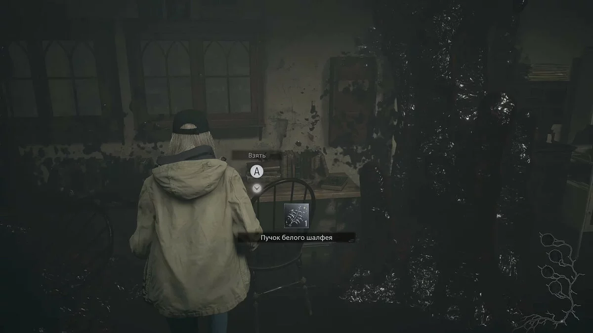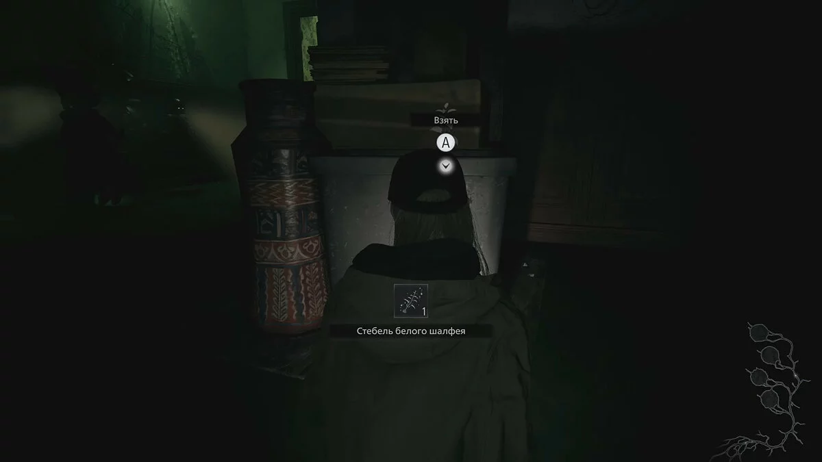 Проходим вперёд. Поднимаемся на второй этаж и осматриваем книгу. Двигаемся по коридору, находим стебель белого шалфея и убиваем монстра.
