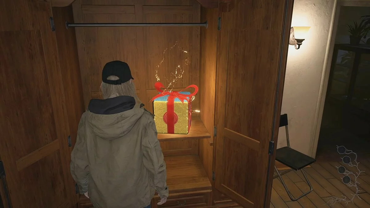Проходим в комнату и находим подарок в шкафу. Заходим в детскую и осматриваем ползунки и кроватку.