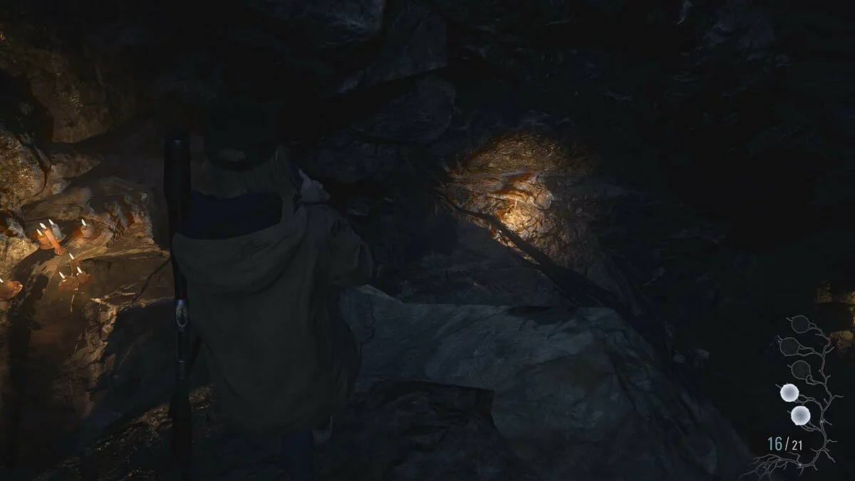 Внизу забираем по две пачки патронов пистолета и дробовика, осматриваем книги, используем печатную машинку для сохранения и находим лекарство и пучок белого шалфея. Спускаемся в пещеры. Осматриваем заметку и двигаемся вперёд.