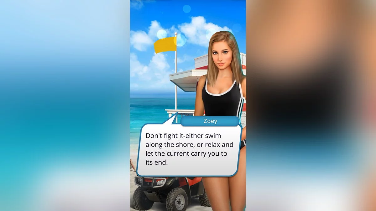 Человек начал тонуть. Зои побежала за помощью, а вы бросились в воду, чтобы спасти его. Оказалось, что это девушка, которая не может удержаться на поверхности воды. Она схватилась за буй, но течение мешает плыть вам к берегу. Что будете делать?