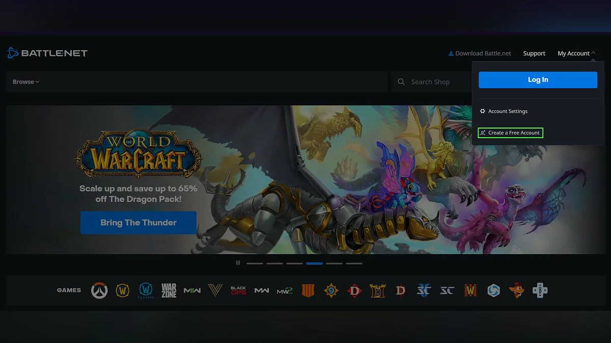 - Начнём с аккаунта. Переходим на официальный сайт Battle.Net и нажимаем кнопку «Create a Free Account» в верхнем правом углу.
