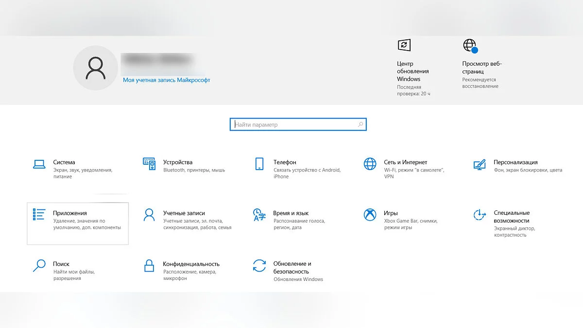 - Нажимаем «Пуск», переходим в «Параметры» и в раздел «Приложения».