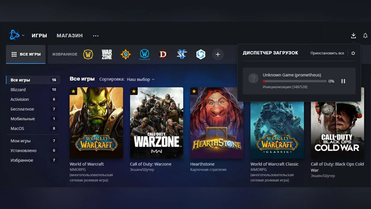 - Если установка не началась, потребуется закрыть клиент и перезапустить файл «Overwatch-Setup». Установка начнётся даже если игра не появилась в магазине, а в диспетчере загрузки появится проект «Unknown Game (prometheus)».