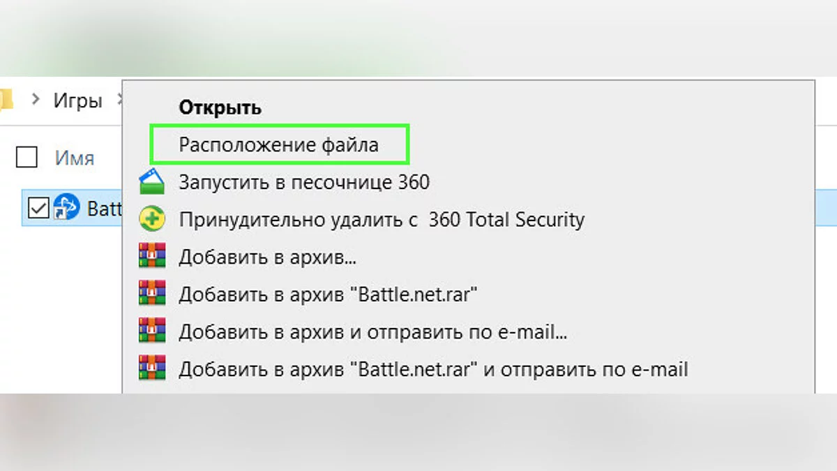 - Заранее нажимаем правой кнопкой мыши по ярлыку Battle.Net и выбираем «Расположение файла…», чтобы потом удалить папку.