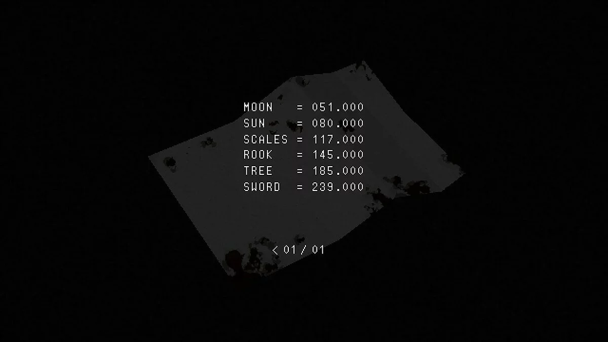 Возвращаемся к документу «Частоты» (Frequencies document) и настраиваем приемник на частоту, связанную с «Мечом». Смотрим появившийся внизу ряд чисел. Осталось только сопоставить эти числа с символами и ввести верную комбинацию к сейфу.