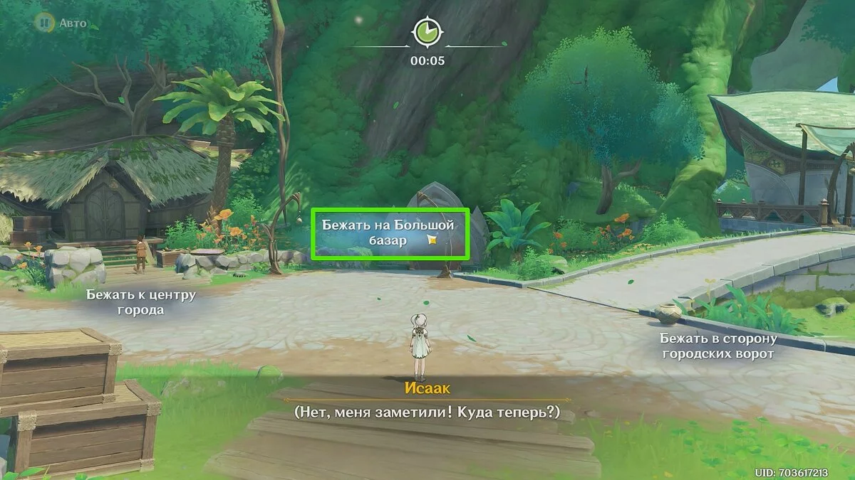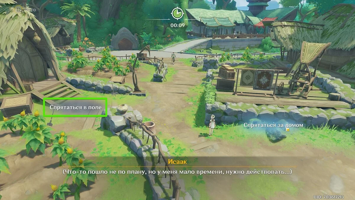 Здесь необходимо подслушать разговор двух сержантов Фатуи так, чтобы остальные охранники вас не заметили. Для этого используйте окружение и передвигайтесь вдоль стены слева. Вы также можете присесть, нажав соответствующую кнопку (на ПК клавиша ЛКМ).