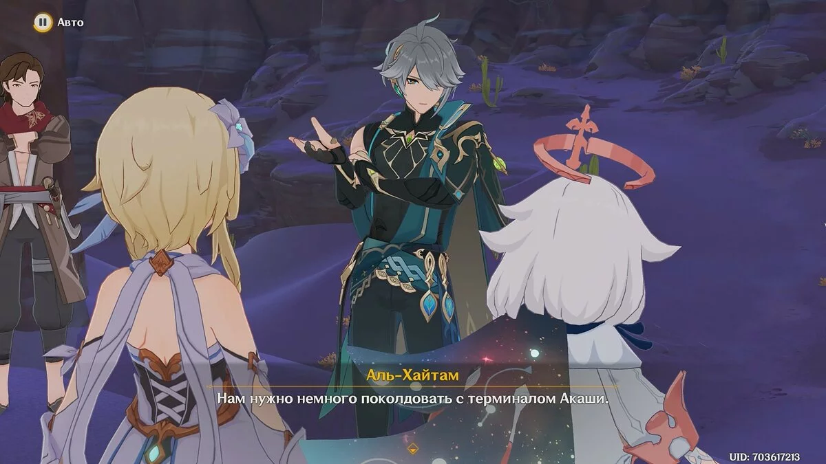 Побеседуйте с аль-Хайтамом и используйте быстрое перемещение на базу Пустынников. Здесь также смотрите продолжительную кат-сцену.