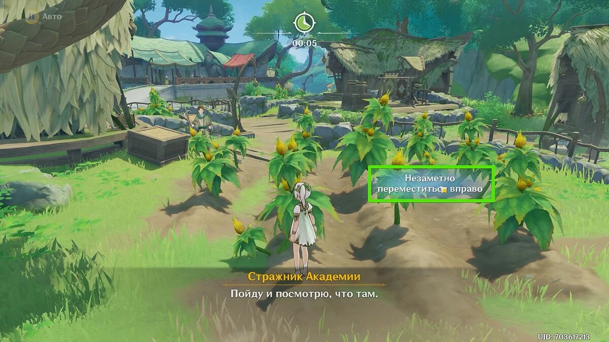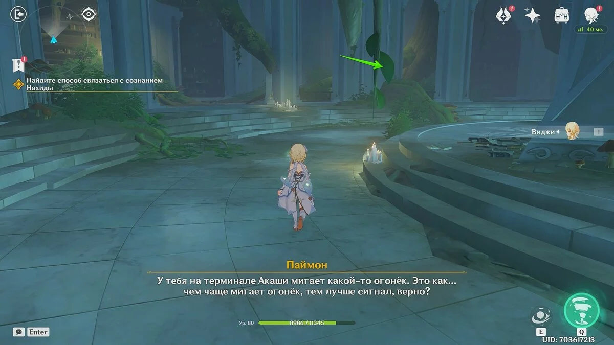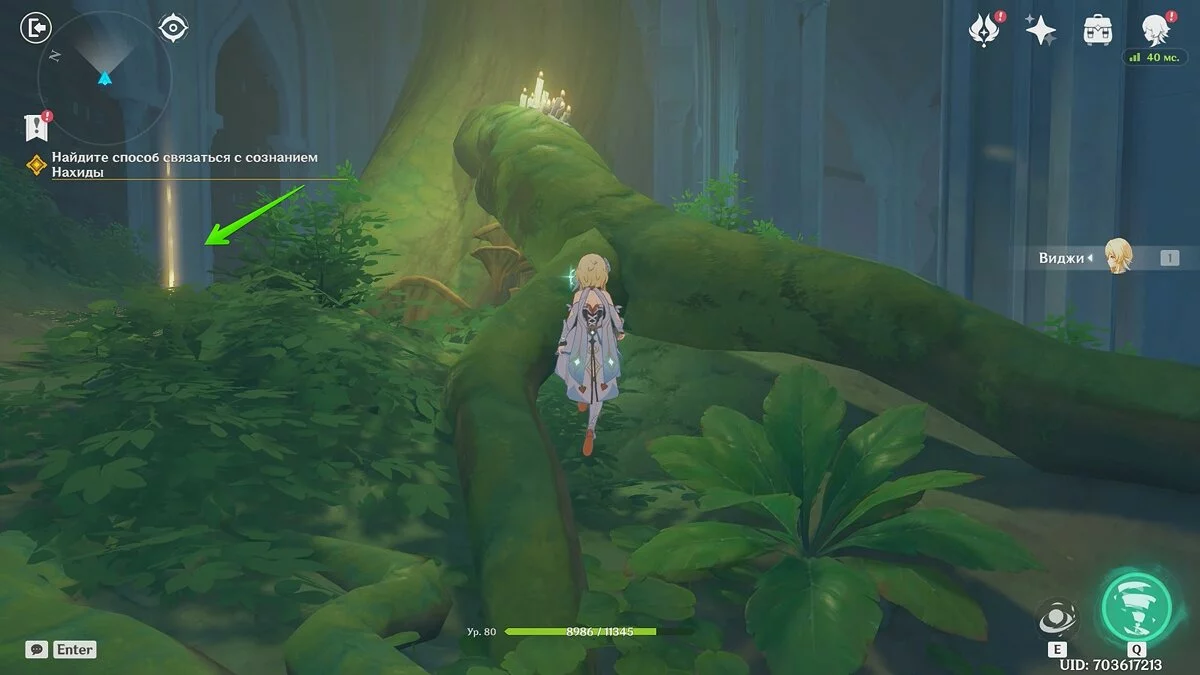 Отправляйтесь к аль-Хайтаму и проследуйте в Академию. С этого момента вы будете наблюдать историю от разных лиц. Когда окажетесь в одиночной камере вместе с Паймон, потребуется найти способ связаться с Нахидой. Осмотрите левую часть комнаты и отыщите ствол дерева. Встаньте позади него и взаимодействуйте с объектом.
