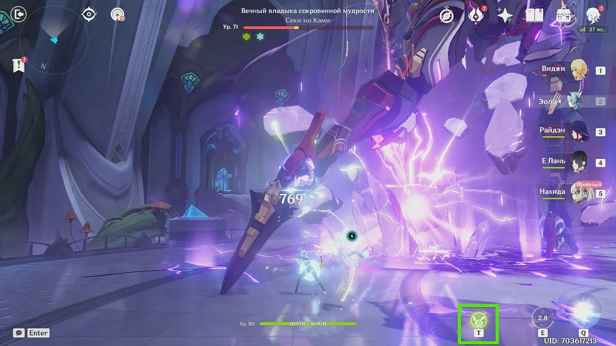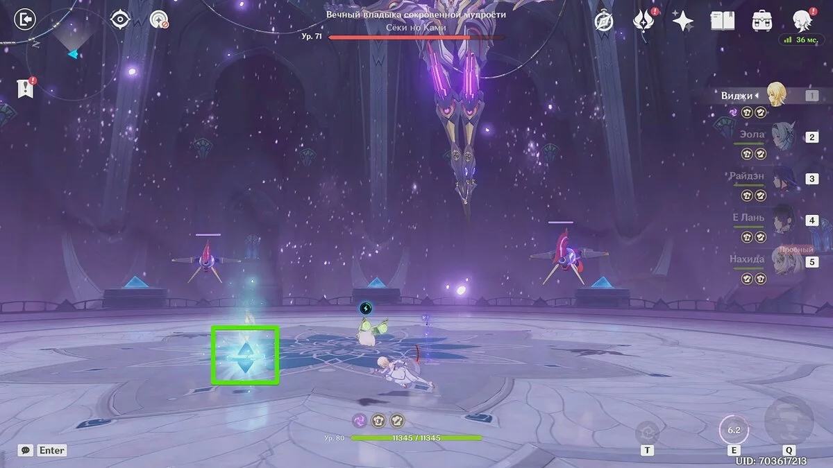 Последний этап битвы — решающий. В вашем отряде появится Нахида, используйте умения и стихию этого персонажа для нанесения урона врагу. Помимо этого, собирайте разбросанные по арене кристаллы. Они нужны для того, чтобы заряжать устройство Нахиды. Когда оно будет полностью заряжено, нажмите кнопку «T».