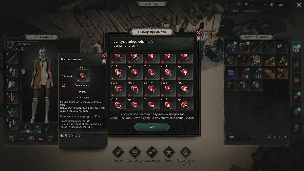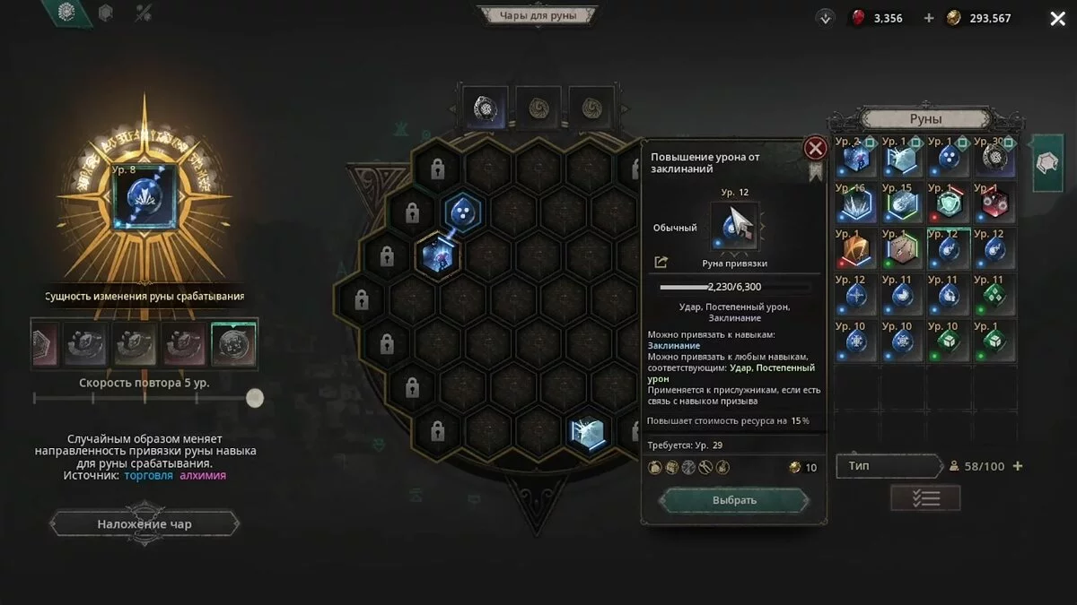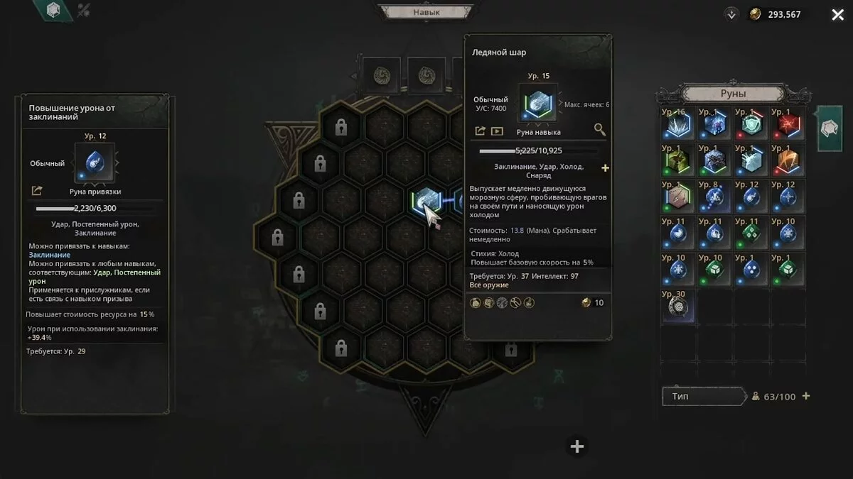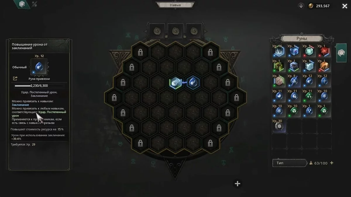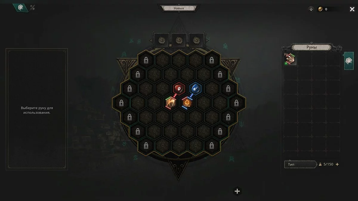 - Окно (доска) навыков — соответствующее меню с ячейками, где пользователи могут изменить набор рун.