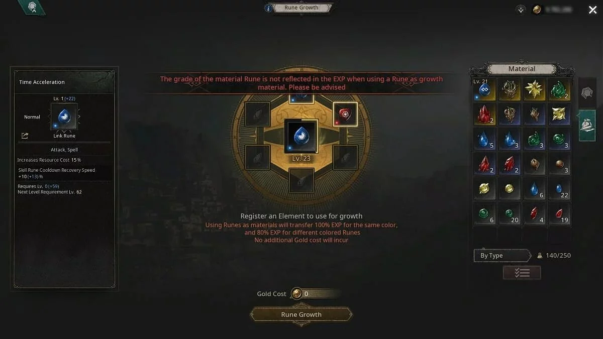 Прокачанные руны можно применить в качестве материала для переноса опыта на другой артефакт. В этом случае 100% опыта добавится предметам одного цвета и только 80% опыта отправится к руне другого цвета. Также обратите внимание на то, что при повышении уровня артефактов требуется выполнение определённых требований, например, соответствие уровня персонажа и наличие подходящего количества очков характеристик.