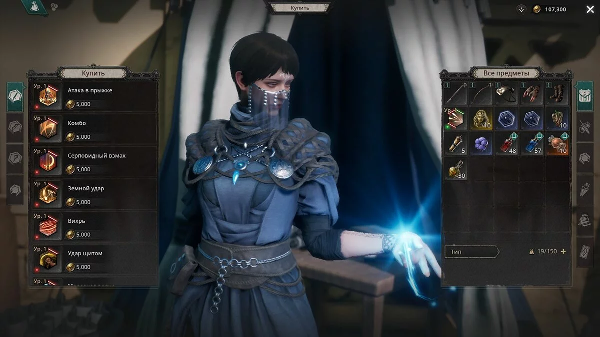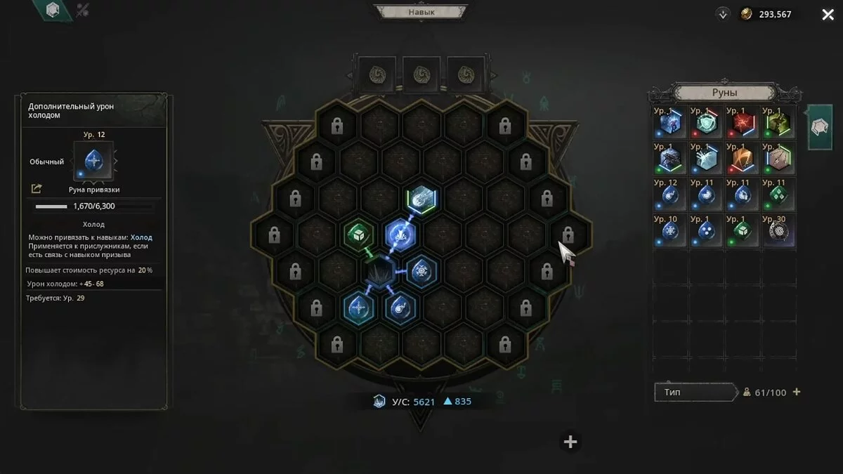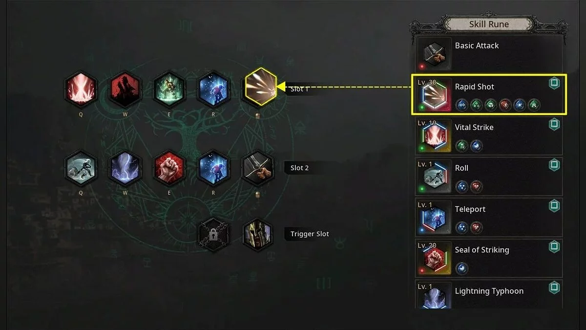 - Слоты для навыков — отдельная вкладка, где распределяются атакующие способности в зависимости от используемых рун на доске навыков.