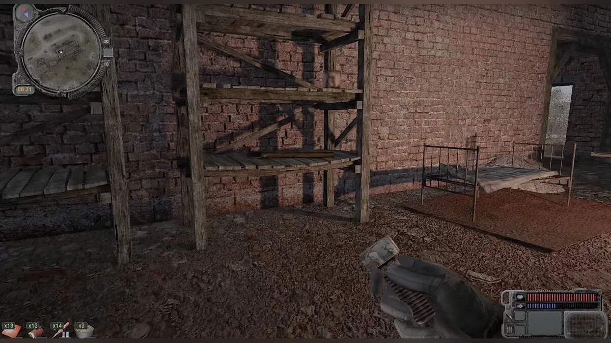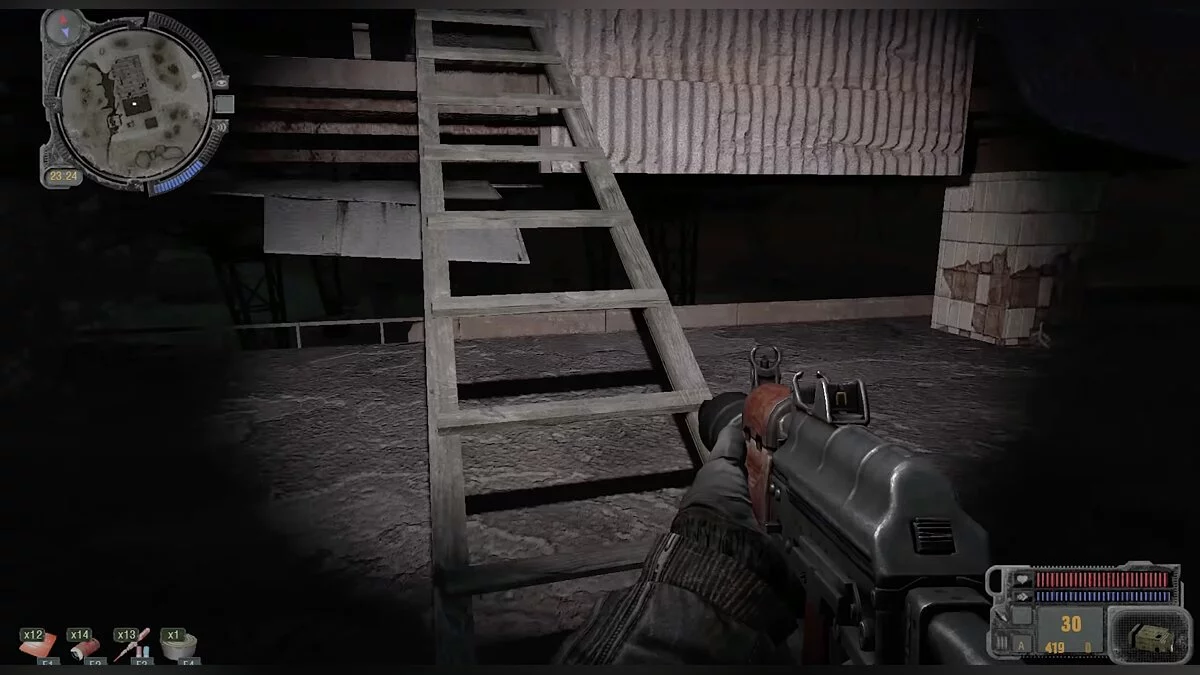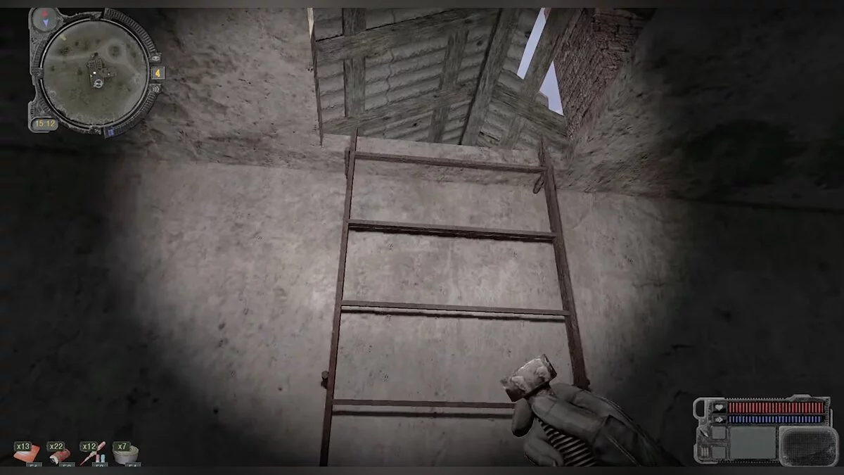 Неподалеку лежит схрон умирающего сталкера, координаты которого дал Петя. Идите к зданию с остатками крыши и заберитесь наверх.